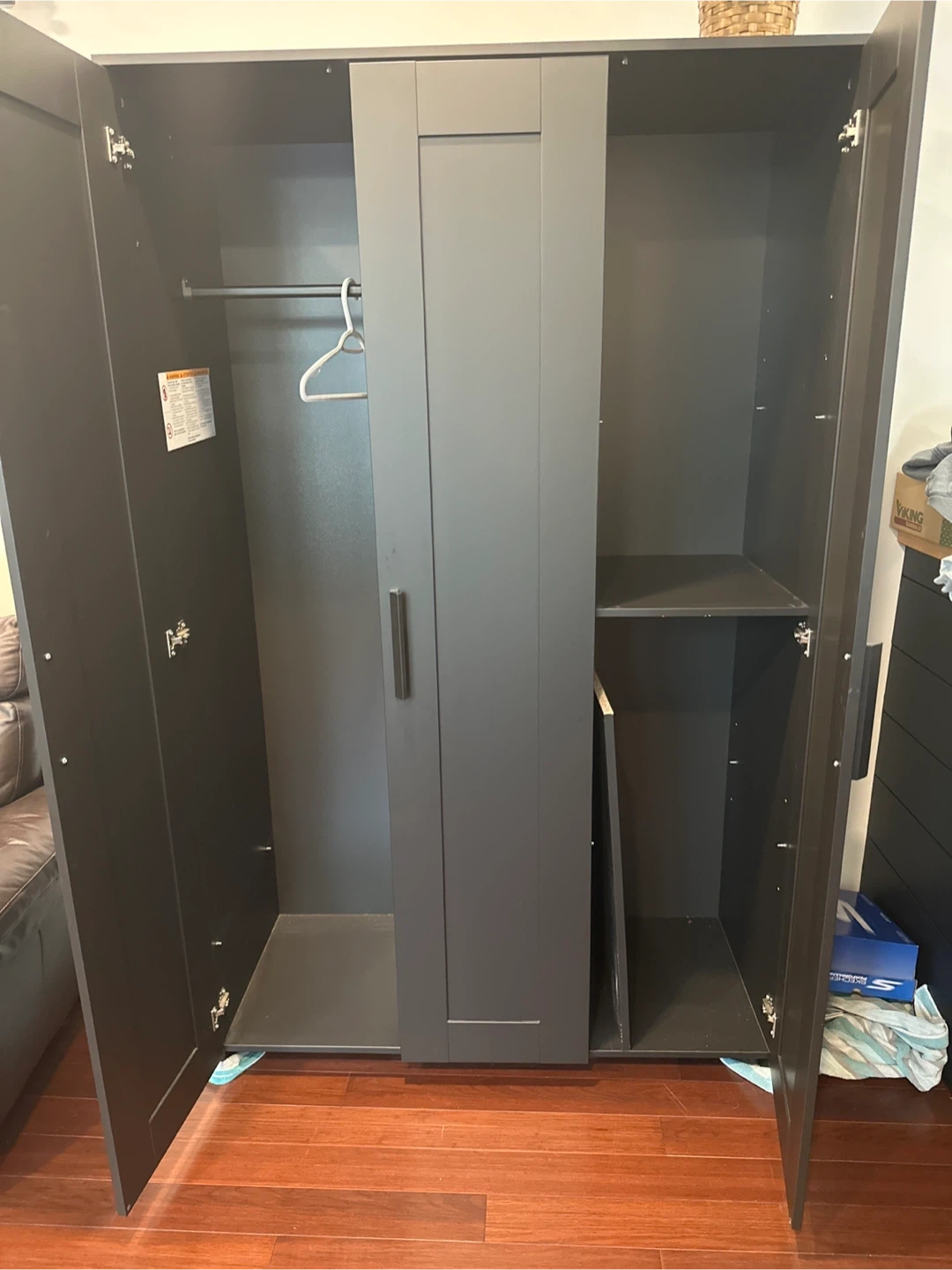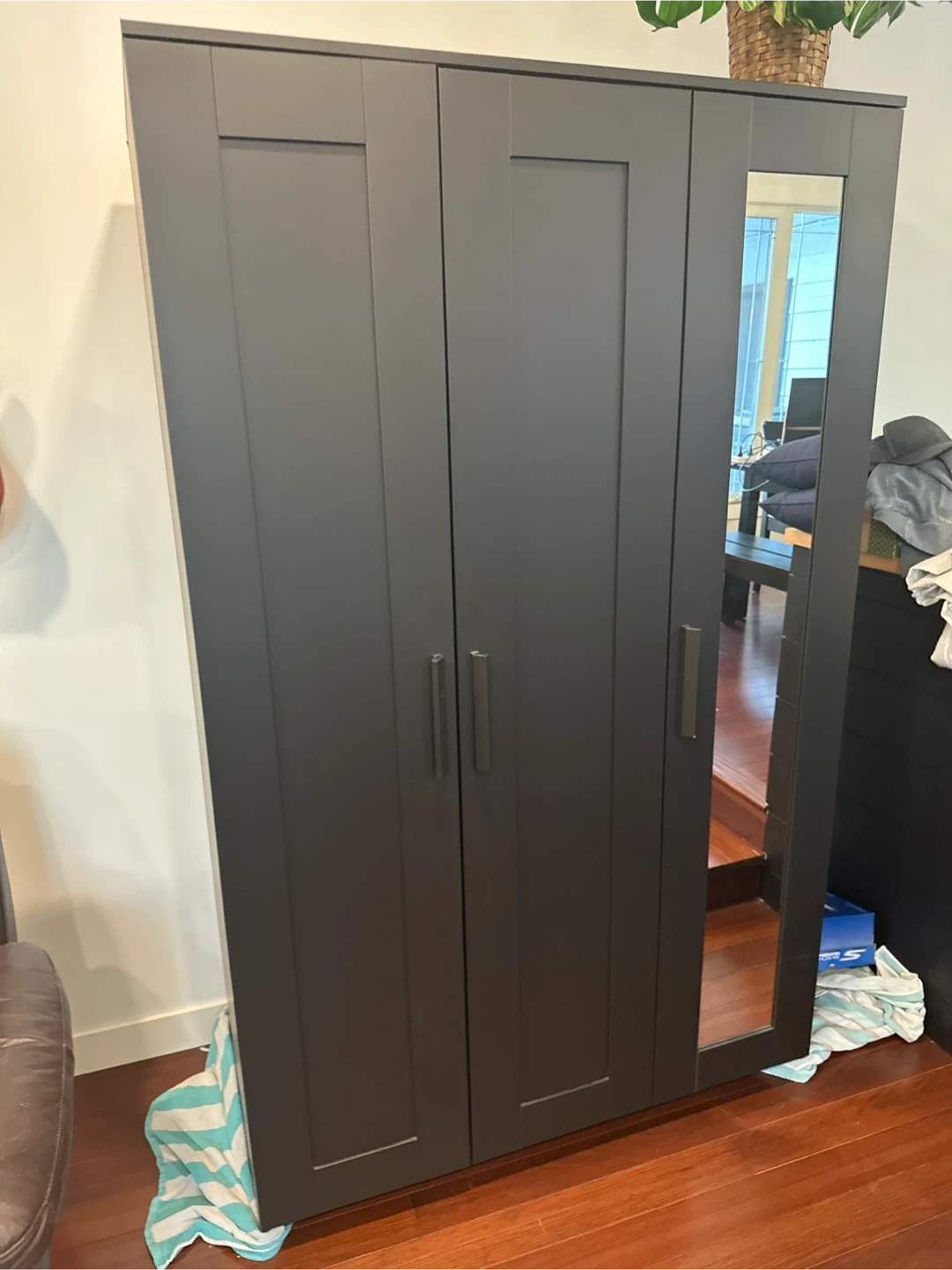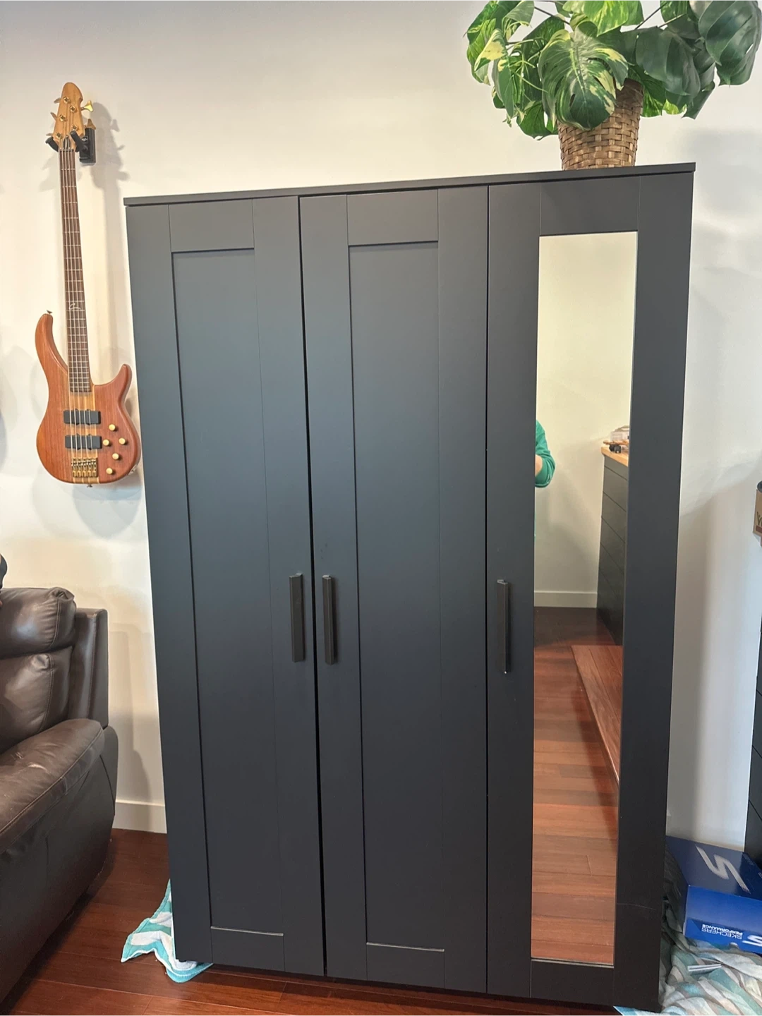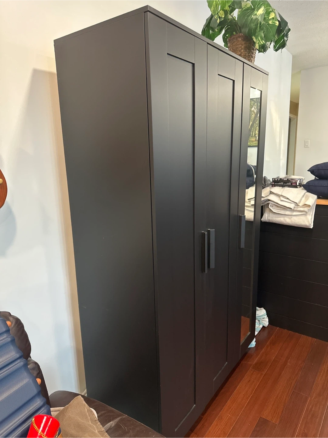 Black IKEA wardrobe like new barely used - with three doors and a full-length mirror on one door. It's 117 cm wide and 190 cm tall. Features a hanging rail and shelves inside for storage.