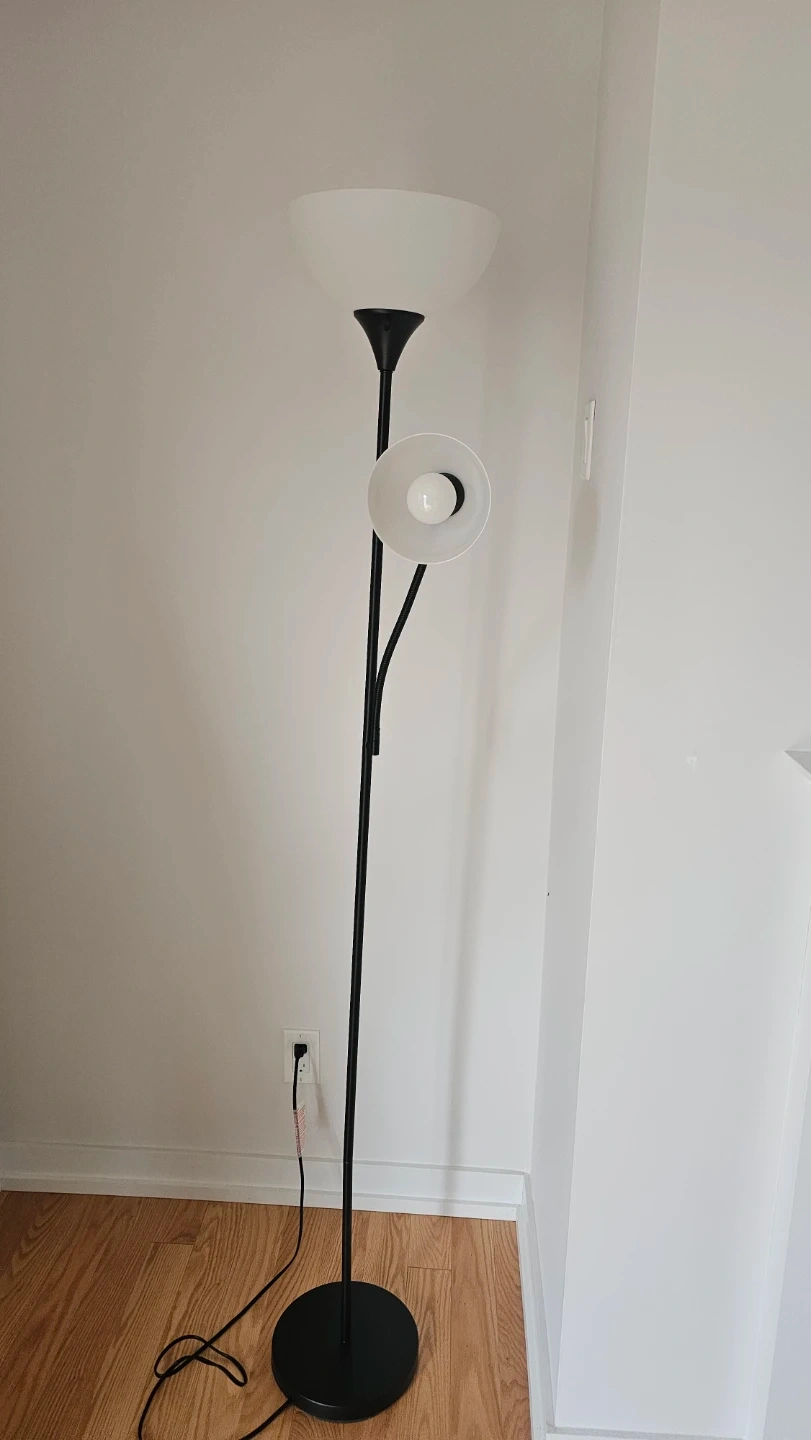 This black floor lamp has two adjustable heads, perfect for directing light where you need it most. It's made of metal with a matte finish. A simple and functional lighting solution for any room!