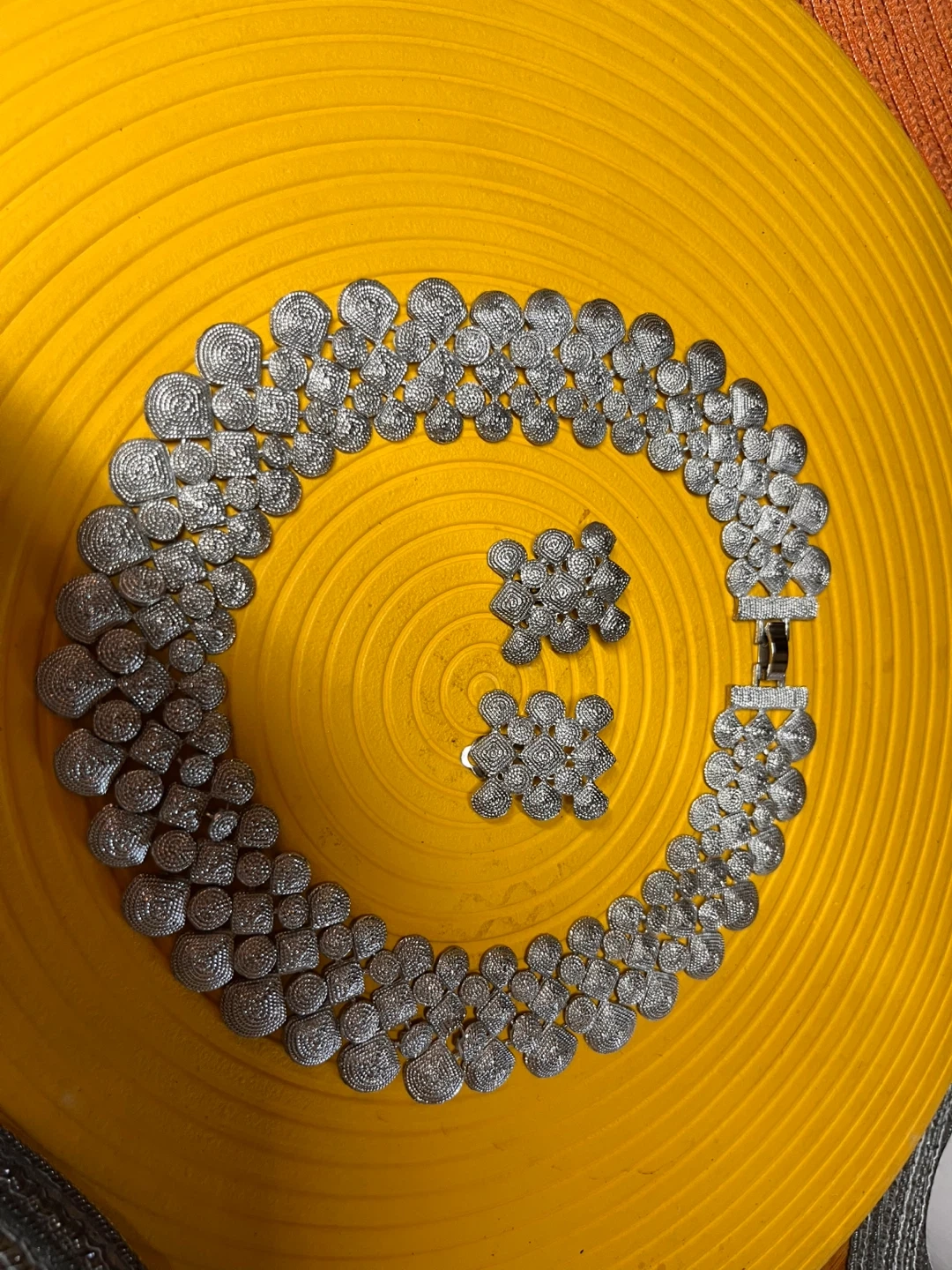 A matching necklace and earring set with a textured, silver-tone finish. The necklace features a multi-layered, circular design. This set adds a statement to any outfit.