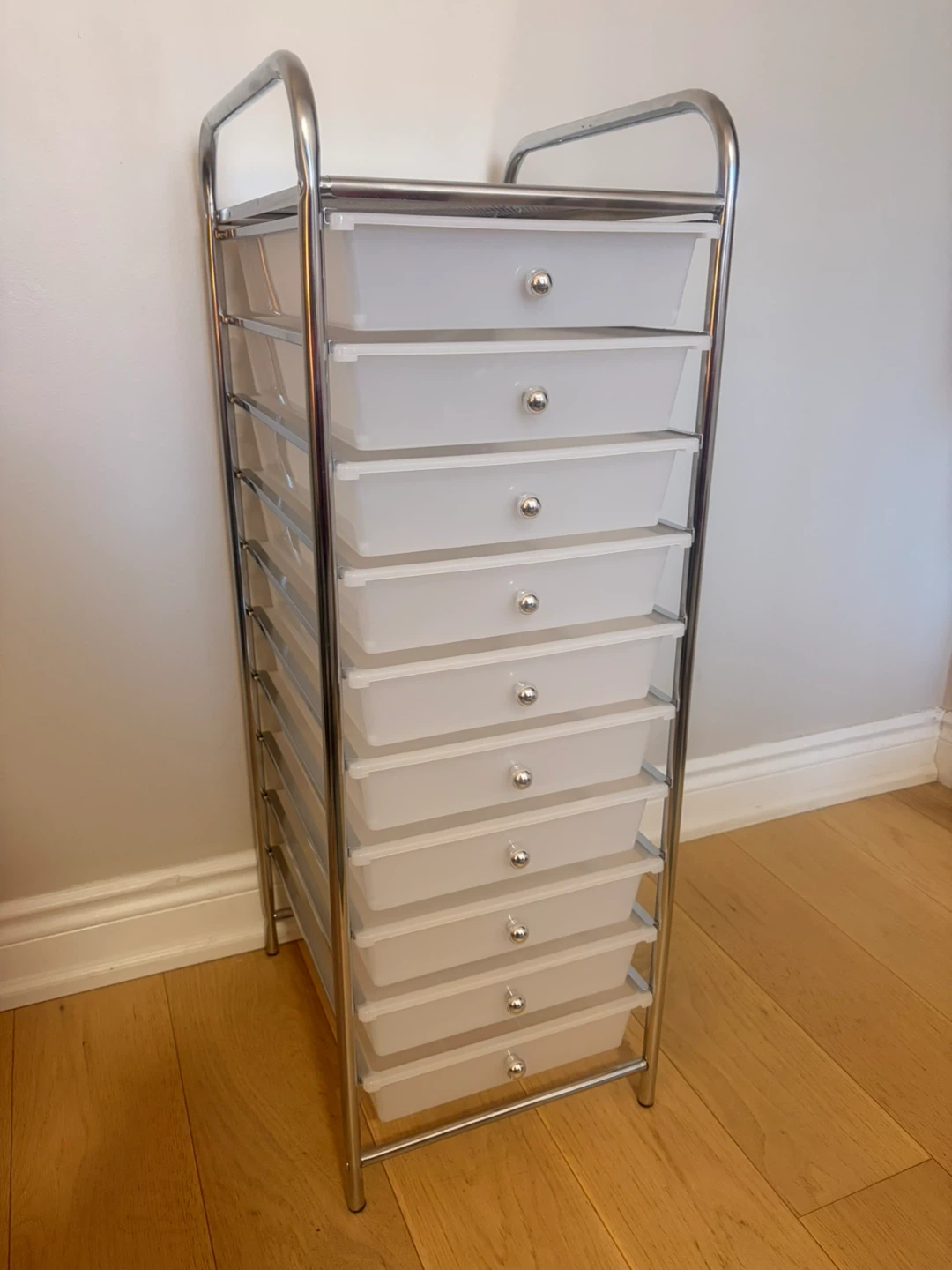 This storage tower comes with ten clear drawers. It's made with a chrome-finished metal frame. It's great for organizing crafts, office supplies, or small items.