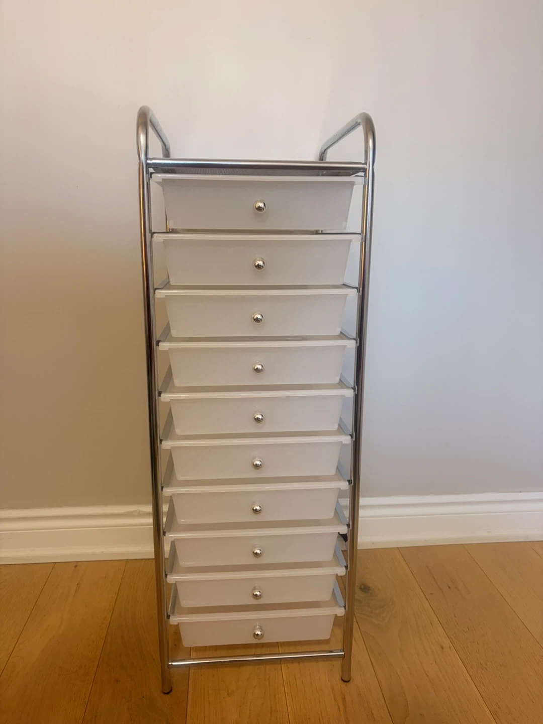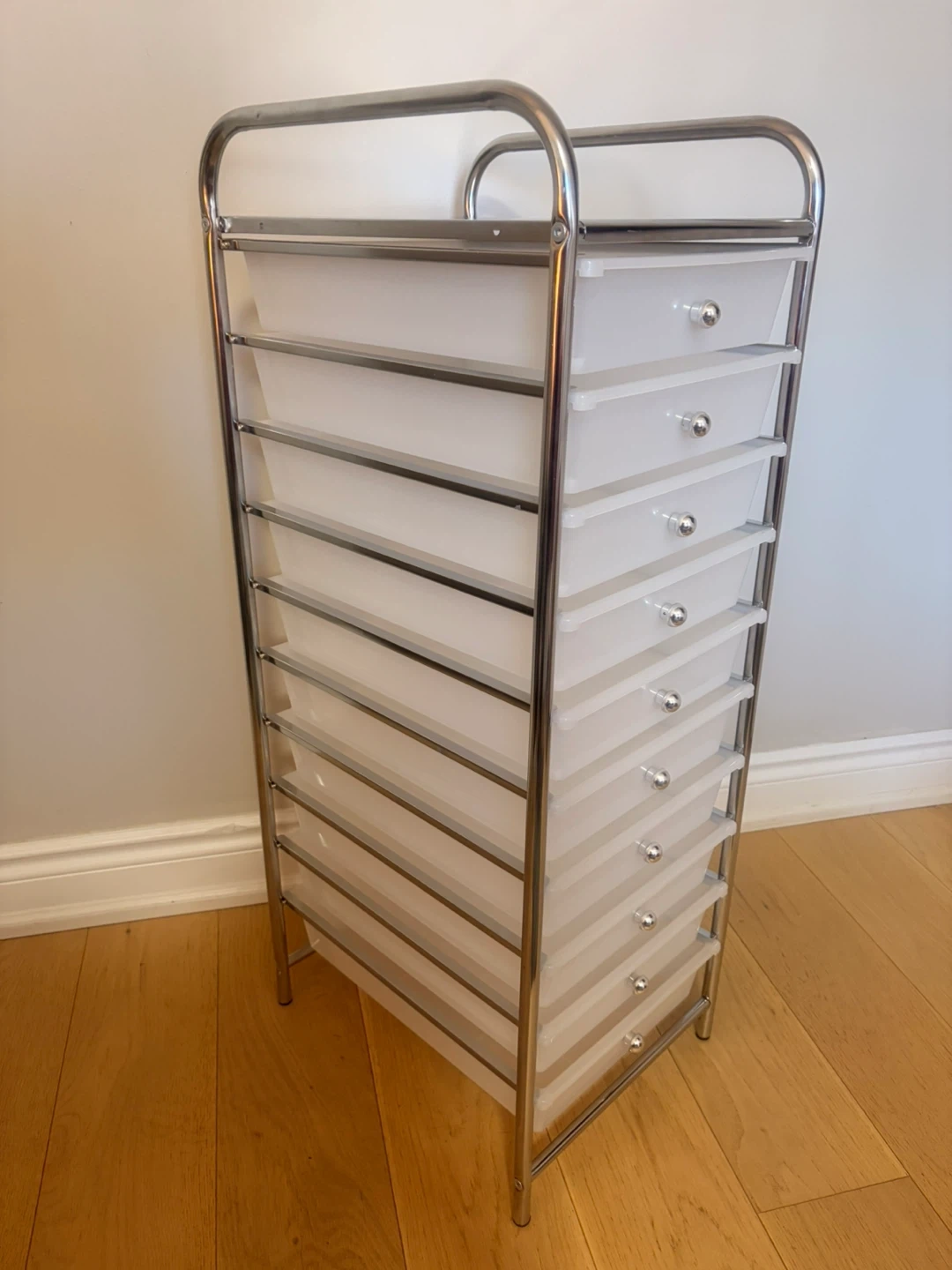 This storage tower comes with ten clear drawers. It's made with a chrome-finished metal frame. It's great for organizing crafts, office supplies, or small items.