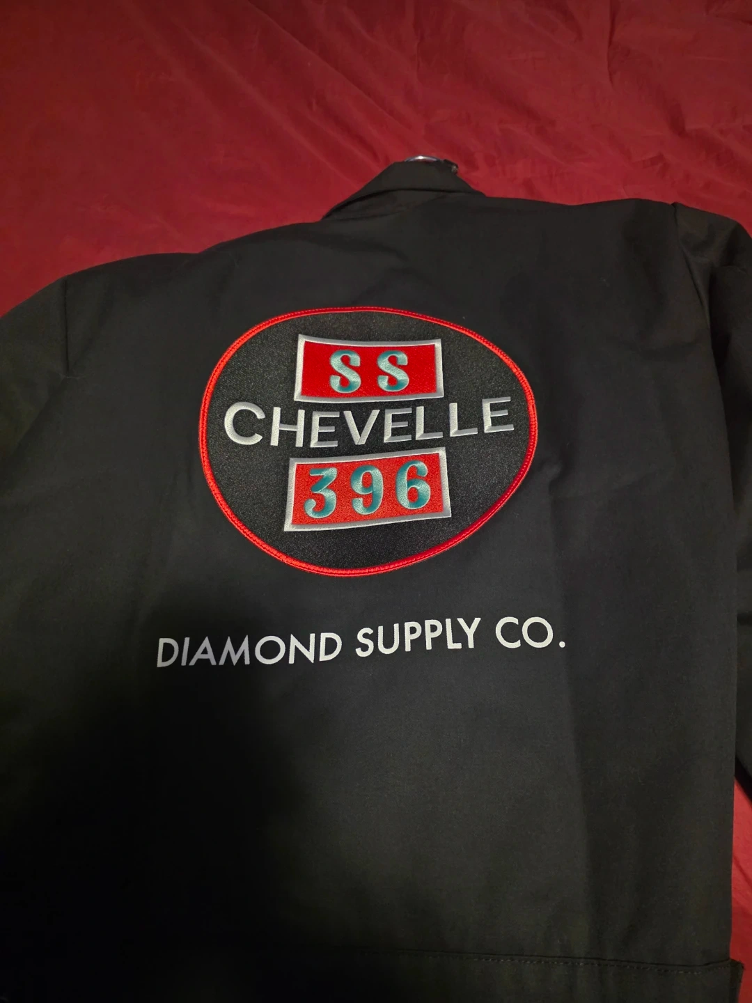 This black jacket features 'SS Chevelle 396' and 'Diamond Supply Co.' embroidery. It's a stylish piece for any car enthusiast. The jacket is made of durable material. It's great for cool weather!