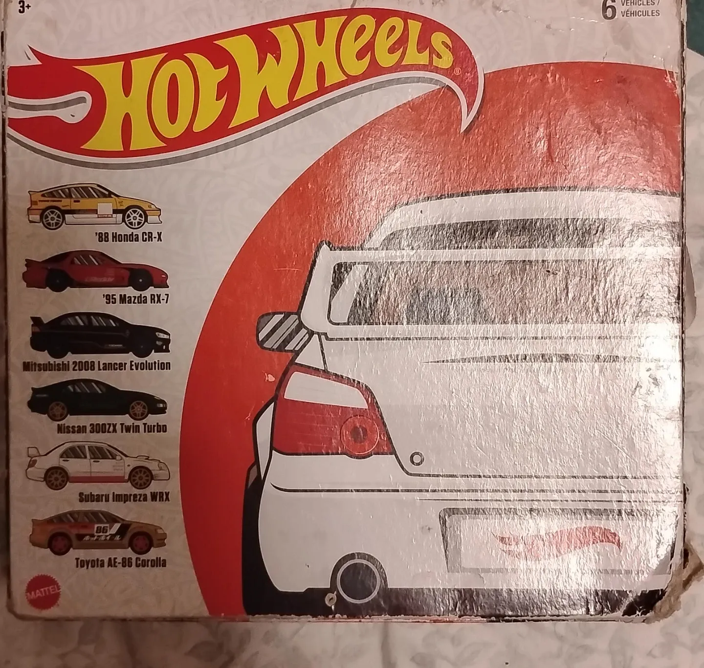 This is a Hot Wheels 6 car collector's set. It features iconic models like the '88 Honda CR-X, '95 Mazda RX-7, and a Subaru Impreza WRX. This set is great for car enthusiasts of all ages!