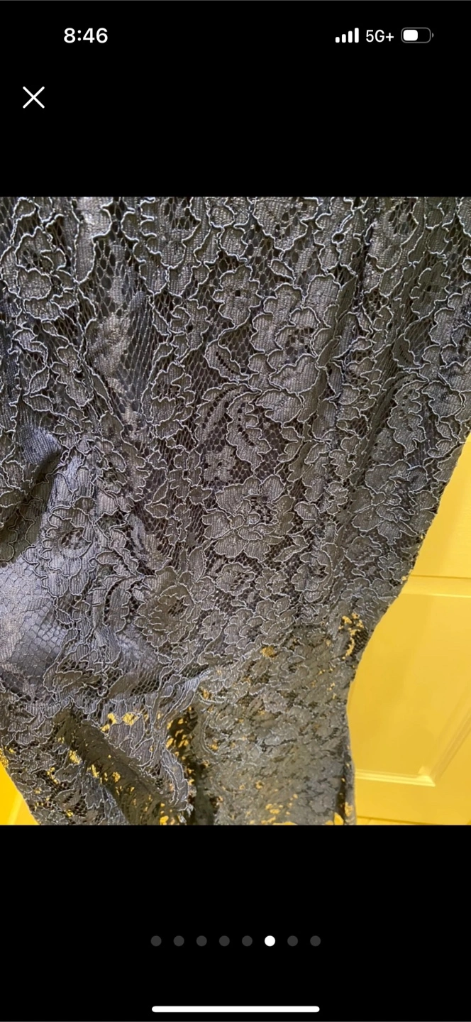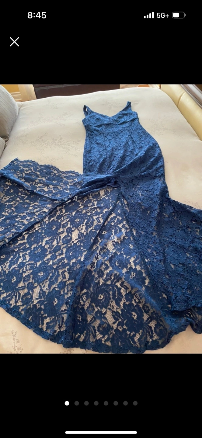 Selling a beautiful Frank Lyman design evening gown in a stunning Royal blue lace. It's in great condition and perfect for a special occasion! The dress is a size 2. It is 58 inches measured from the shoulder to the bottom and has a slit in the front. Lined up to the knee area.