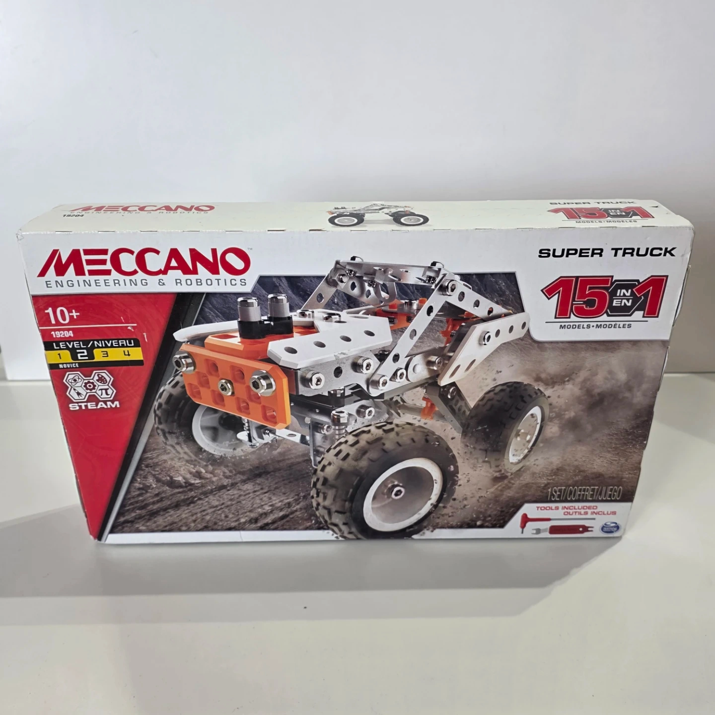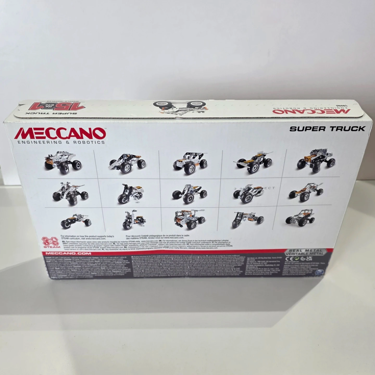 This Meccano Super Truck building set lets you construct 15 different models. It's designed for ages 10+ and promotes STEAM learning. Includes tools and parts for building.