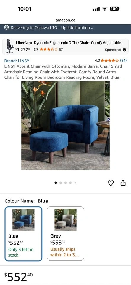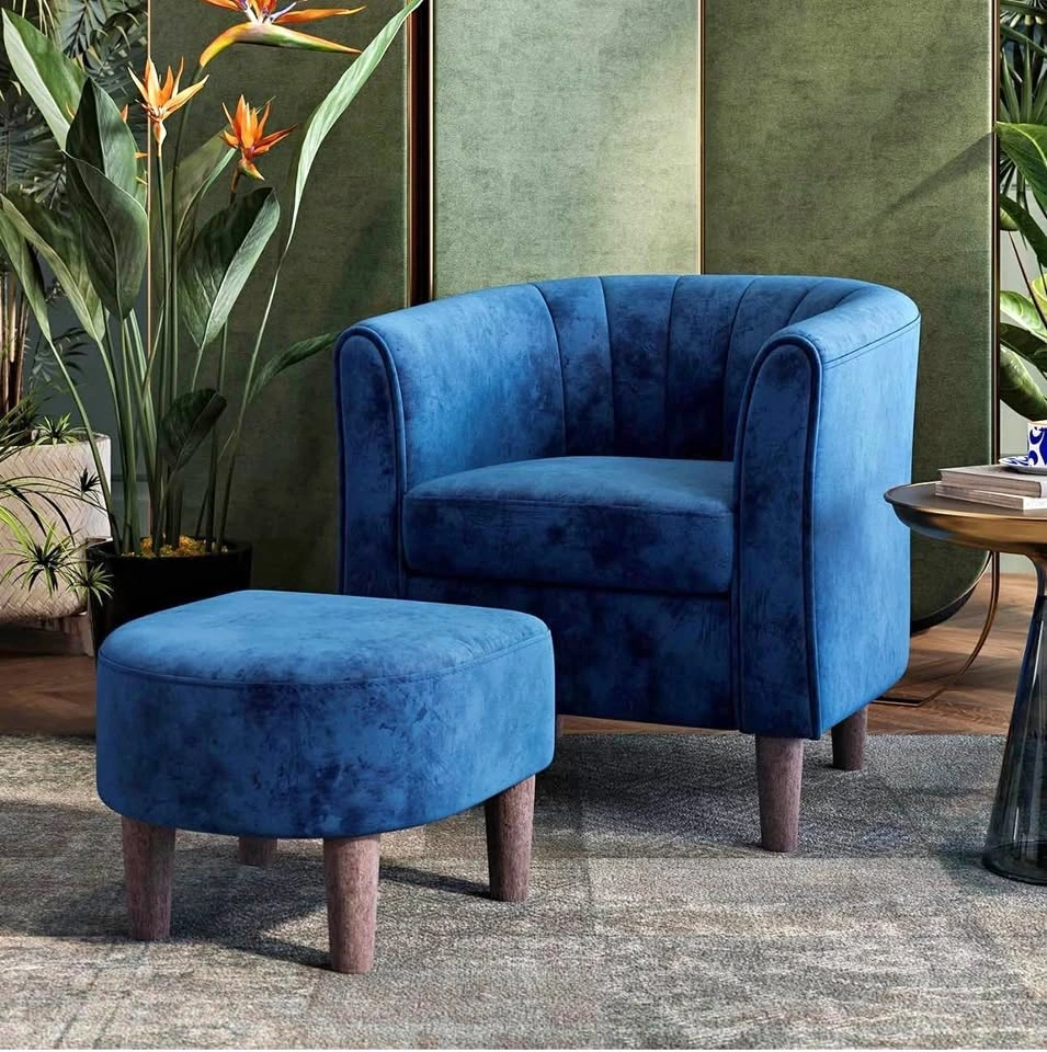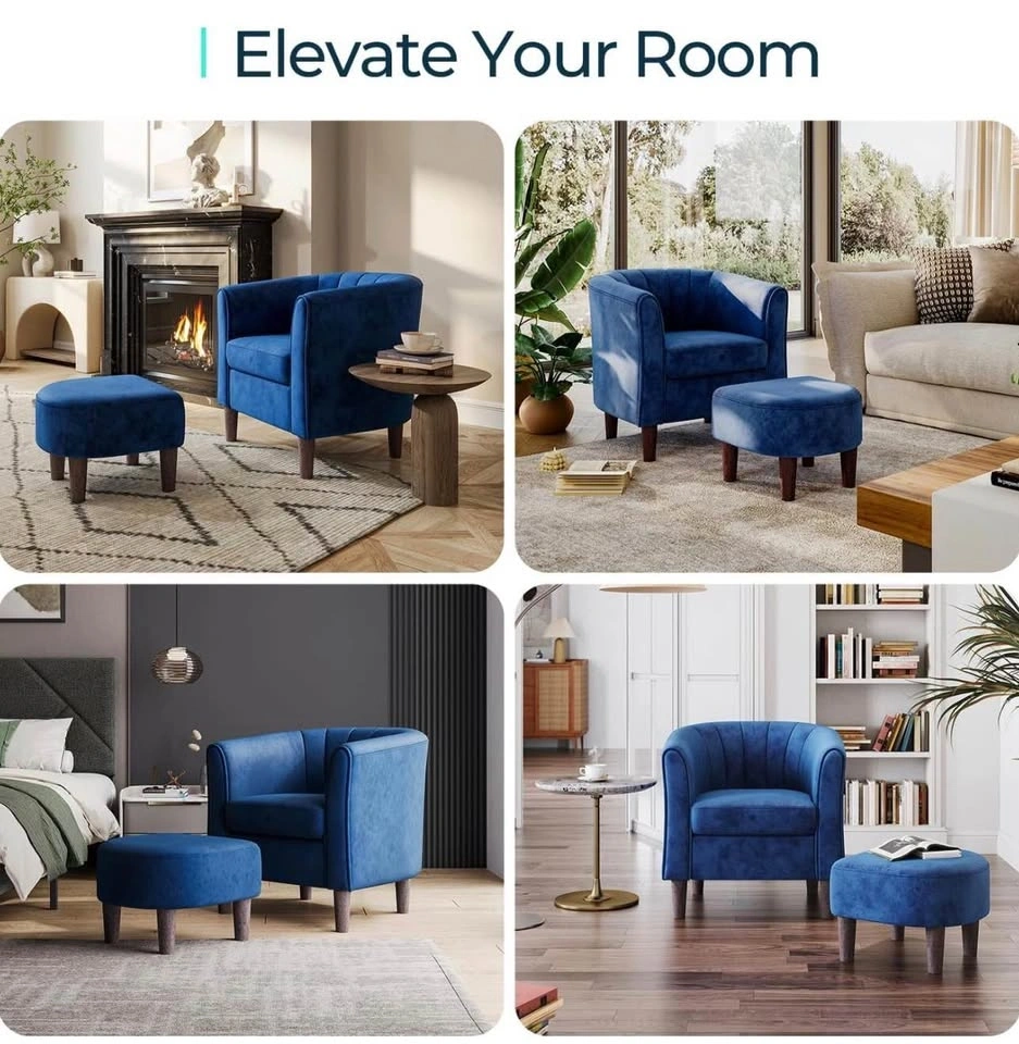 Premium blue velvet accent chair with a unique fanning backrest and arms. Includes a matching round ottoman with wooden legs. Fabric is designed for easy maintenance and durability. Chair supports up to 300 lbs and ottoman supports up to 250 lbs.
