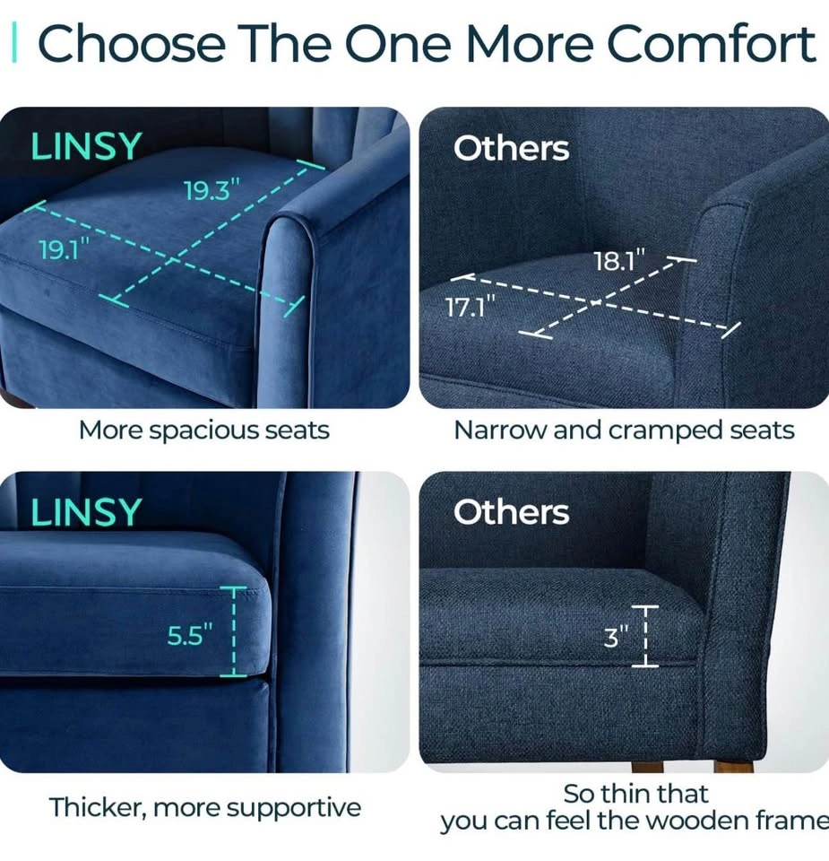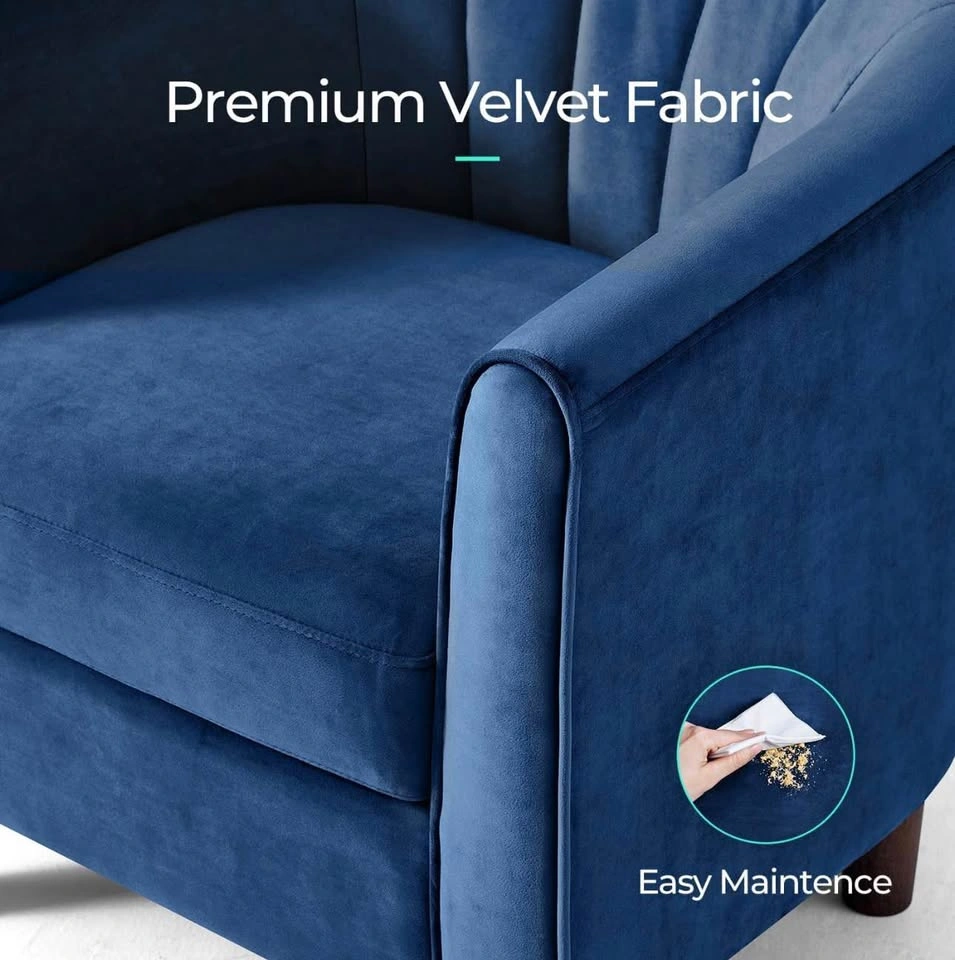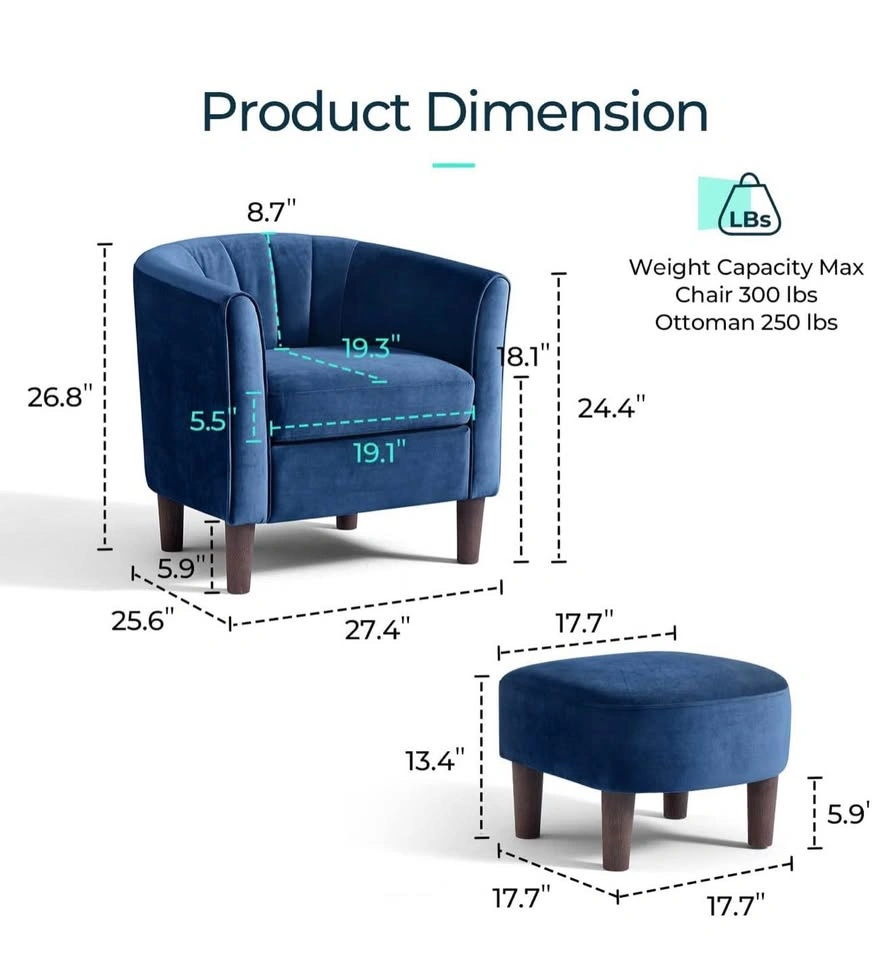 Premium blue velvet accent chair with a unique fanning backrest and arms. Includes a matching round ottoman with wooden legs. Fabric is designed for easy maintenance and durability. Chair supports up to 300 lbs and ottoman supports up to 250 lbs.