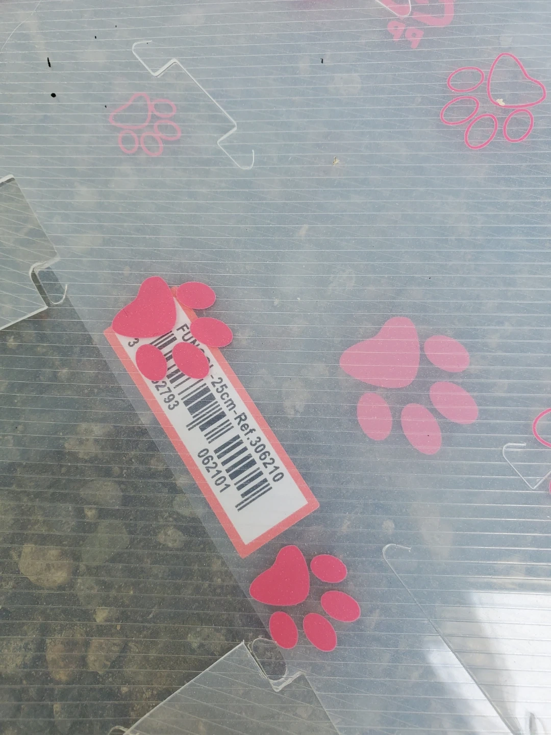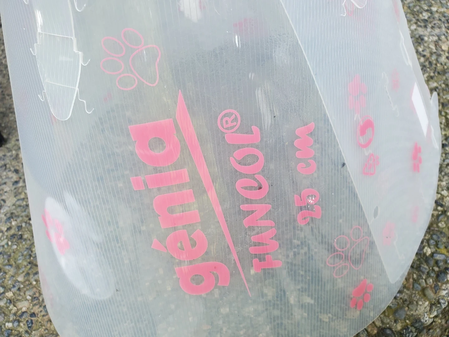 This is a Génia Turool Elizabethan collar for pets. It's a clear plastic cone with a paw print design. Measures 25cm in length, perfect for keeping pets from reaching wounds. Cedar pick up.