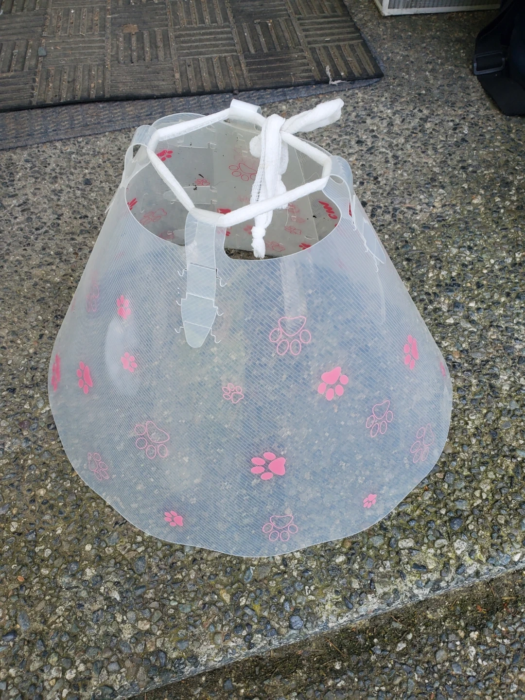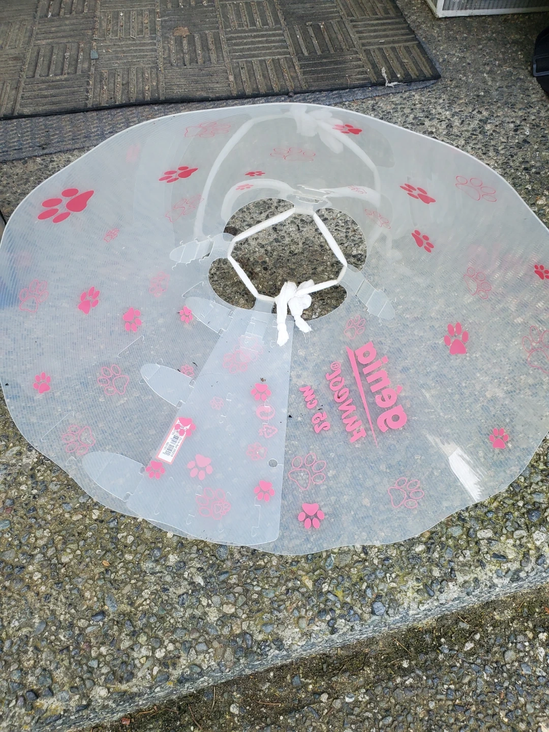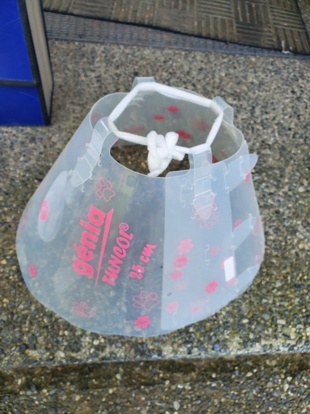 This is a Génia Turool Elizabethan collar for pets. It's a clear plastic cone with a paw print design. Measures 25cm in length, perfect for keeping pets from reaching wounds. Cedar pick up.