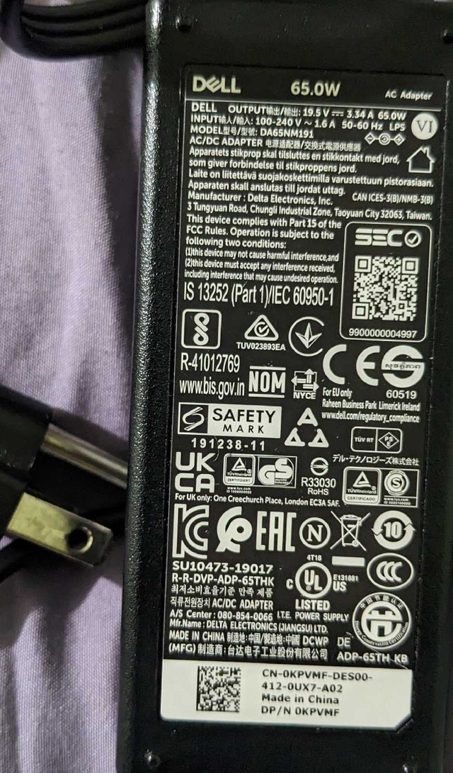Very good condition. Genuine Dell 65W AC adapter suitable for many Dell laptops. Stable power output, ideal as a replacement or spare charger. Standard Dell barrel pin connector. Reliable for daily use. Includes: Power adapter + attached power cable Pickup: Dufferin & Lappin