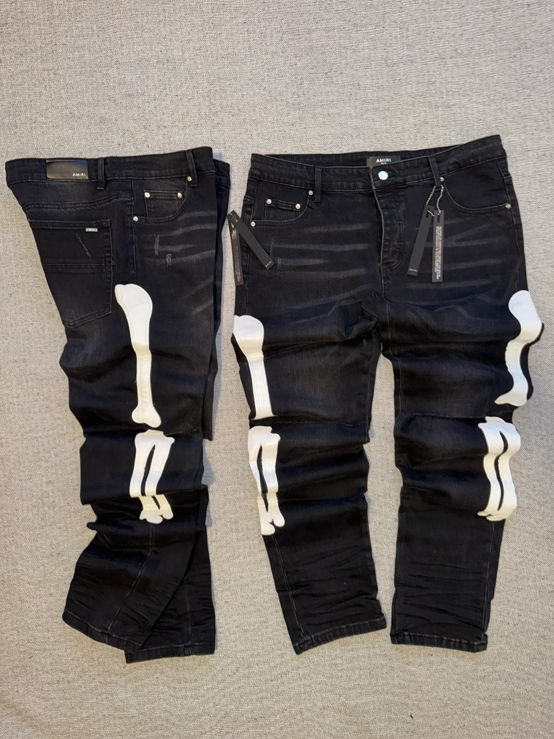 AMIRI black denim jeans with iconic white skeleton bone appliqué. These pants have a distressed finish and a slim fit. Includes original tags.