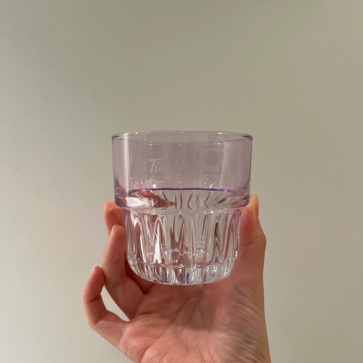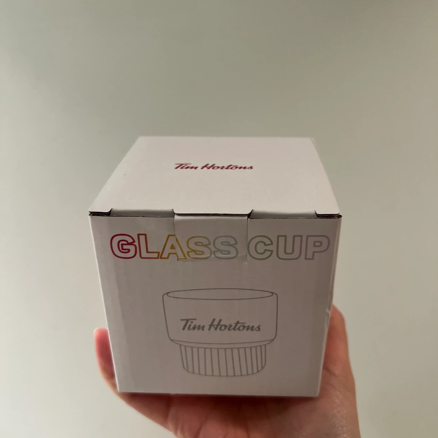 Limited Edition Tim Hortons branded glass cup. It's made of clear glass with a purple tint at the top. Comes with its original box. A nice collectible for any Tim Hortons fan!