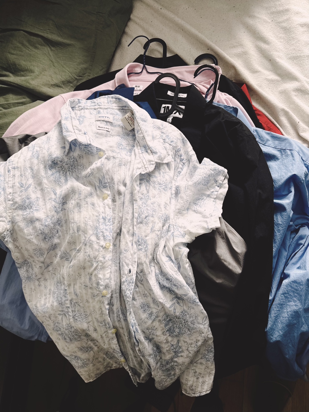 A bunch of slim fitting medium size button down shirts. Full sleeve and a short sleeve one. Great condition. Moving away so won’t need them anymore.