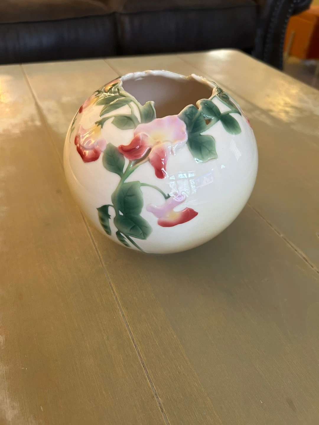 Vintage Franz Collection Sweet Pea Rose Bowl Vase xP1891 unique scalloped rim ,porcelain with gloss finish pretty pink and flowers with greenery in excellent condition 5”x6”