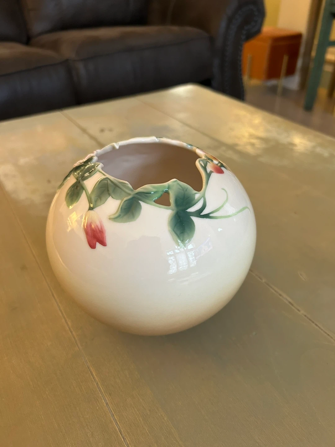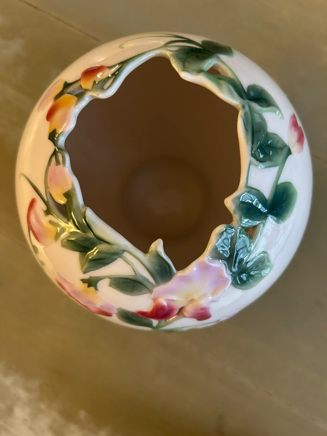 Vintage Franz Collection Sweet Pea Rose Bowl Vase xP1891 unique scalloped rim ,porcelain with gloss finish pretty pink and flowers with greenery in excellent condition 5”x6”