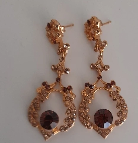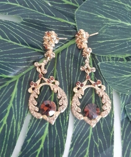 Elegant gold-tone dangle earrings featuring ornate detailing and a large central brown jewel. These earrings are adorned with smaller clear and dark rhinestones. They'd be perfect for dressing up any outfit for a special occasion!