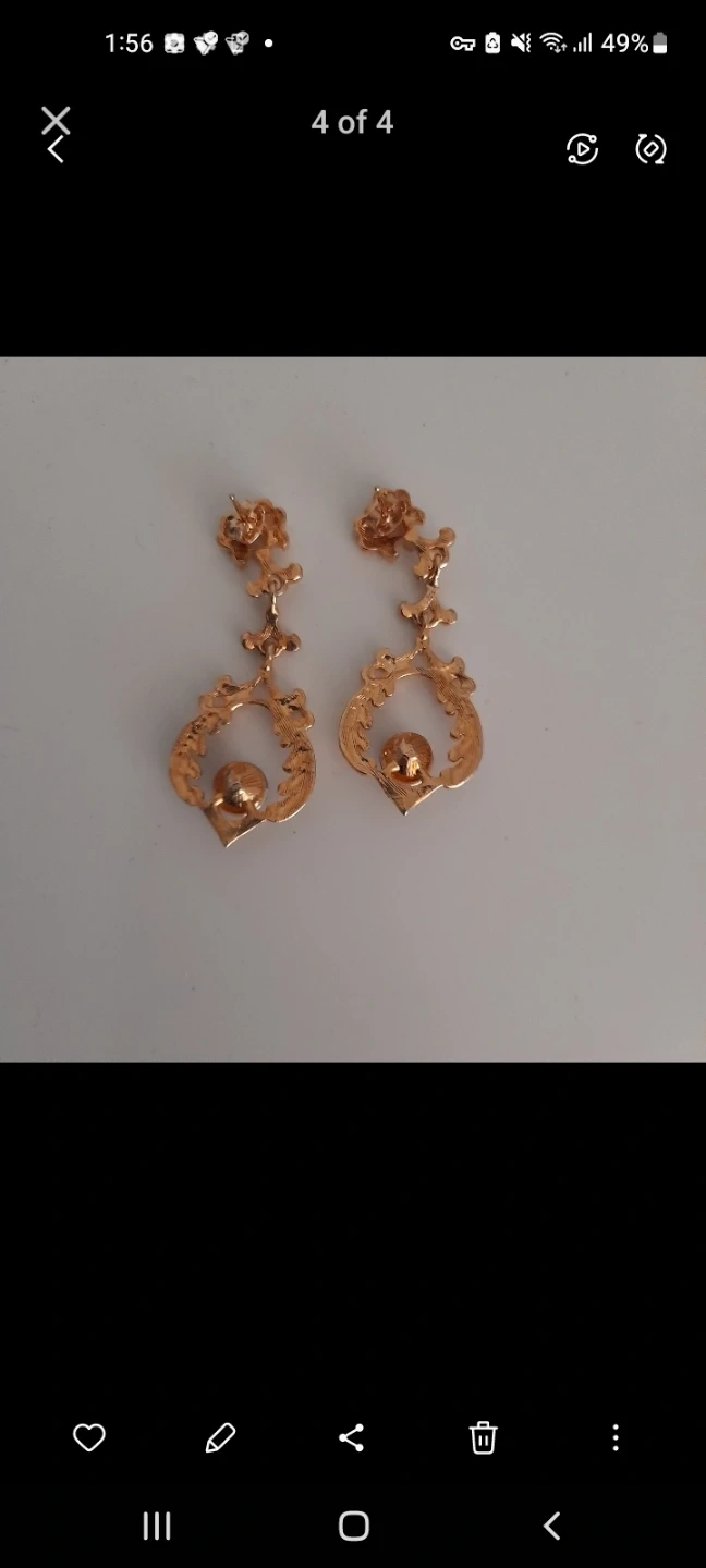 Elegant gold-tone dangle earrings featuring ornate detailing and a large central brown jewel. These earrings are adorned with smaller clear and dark rhinestones. They'd be perfect for dressing up any outfit for a special occasion!