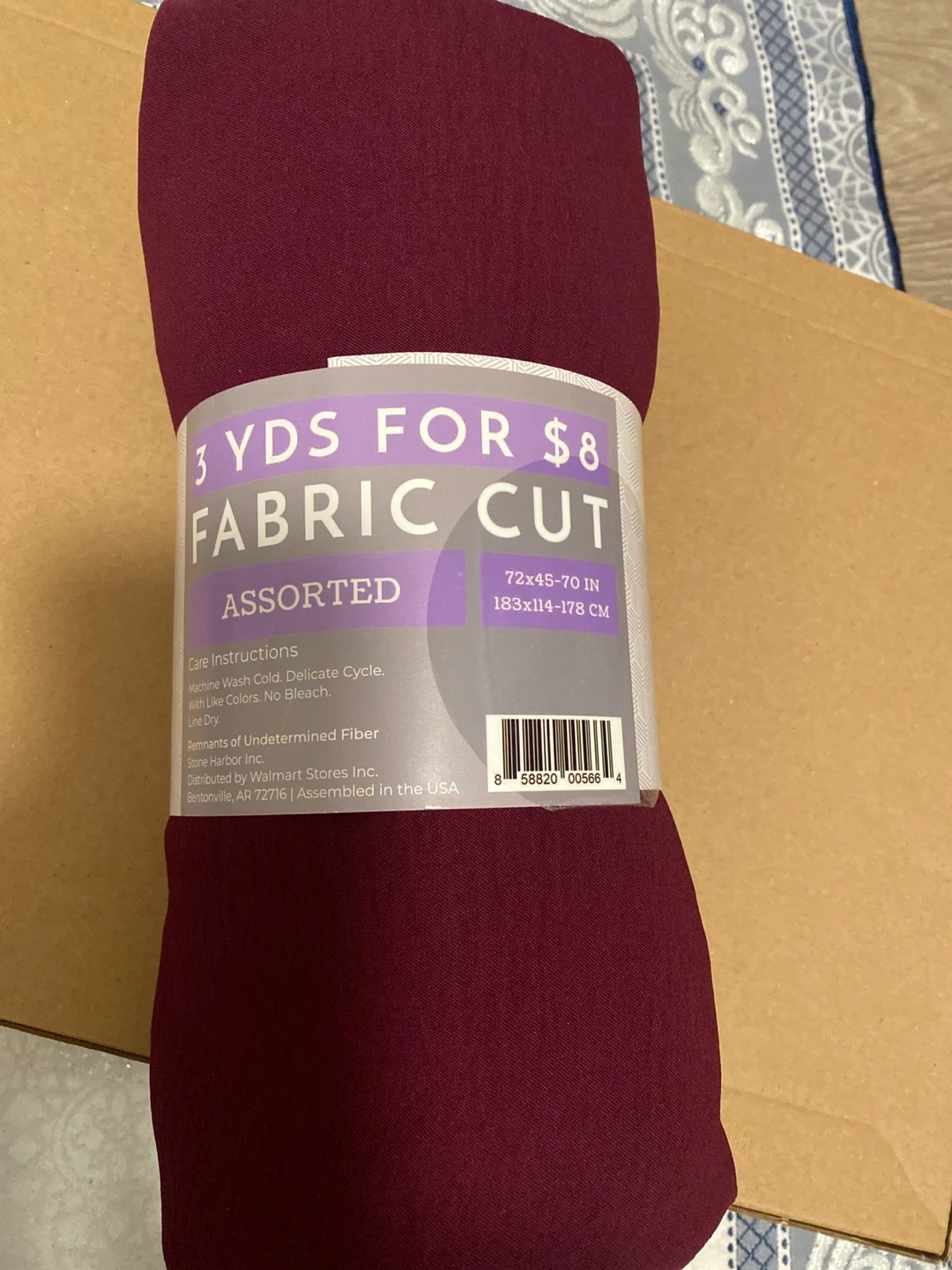 This is a fabric cut, sold as assorted and includes 3 yards. It measures 72x45-70 inches or 183x114-178 cm. Care instructions are machine wash cold, delicate cycle, with like colors, no bleach, and line dry.