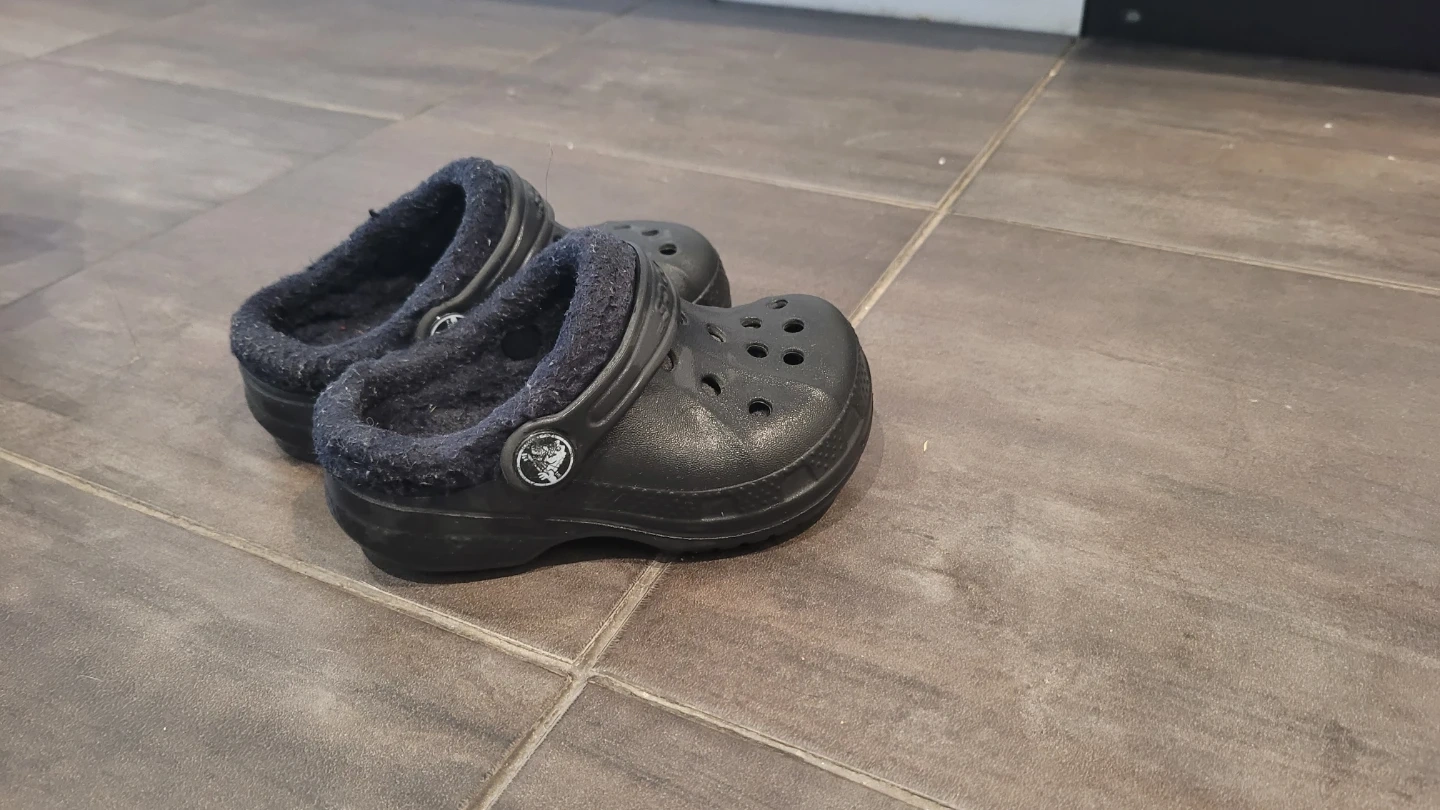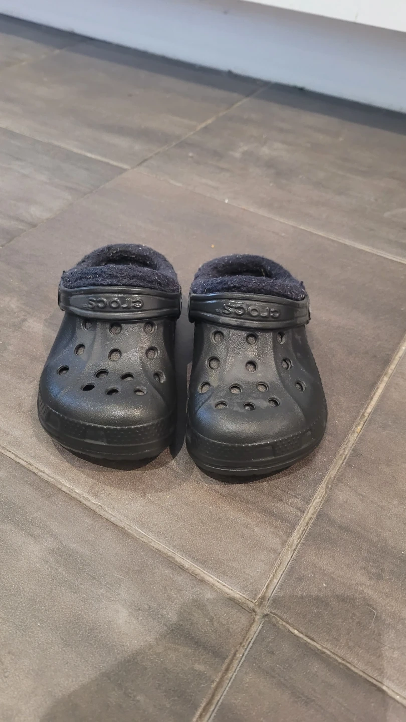 Selling a pair of Crocs clogs in size 6/7. They are black and have a fuzzy interior. Perfect for keeping your little one's feet warm and cozy!