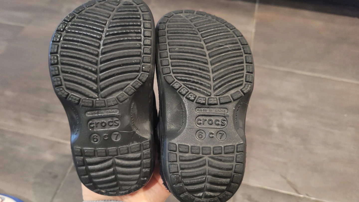 Selling a pair of Crocs clogs in size 6/7. They are black and have a fuzzy interior. Perfect for keeping your little one's feet warm and cozy!