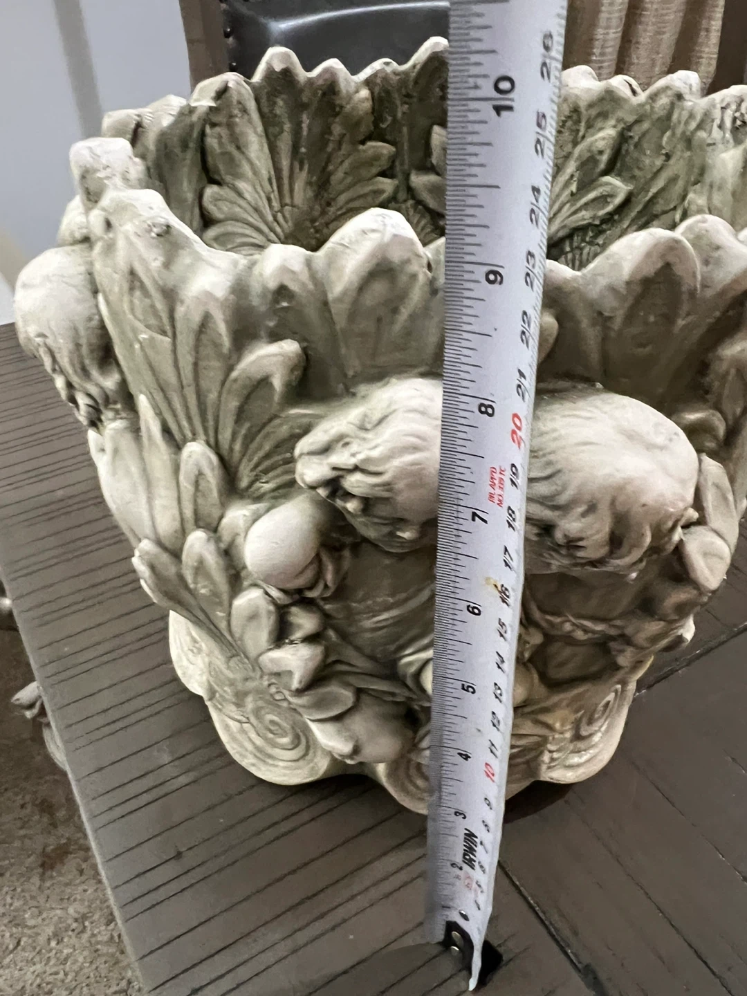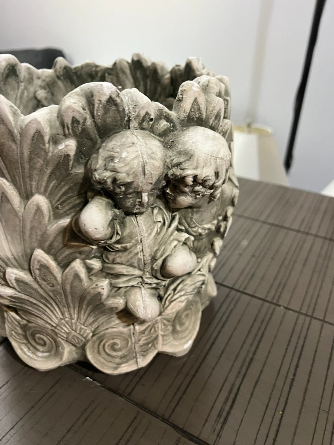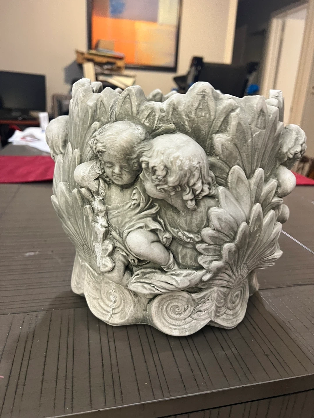 This decorative planter pot features an intricate cherub angel design. It's made from a durable stone-like material, perfect for outdoor use. This pot would look great on a patio or in a garden!