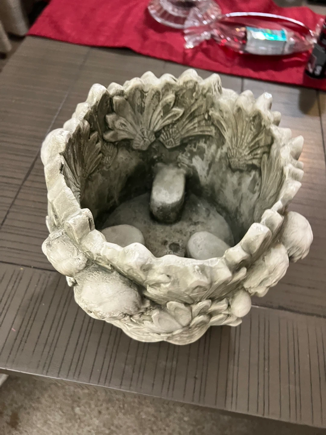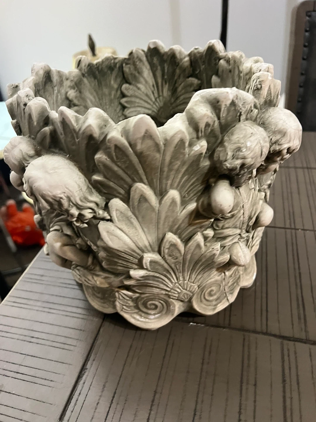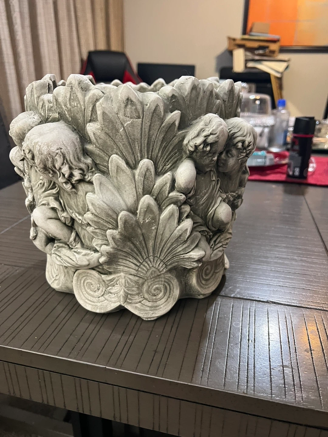 This decorative planter pot features an intricate cherub angel design. It's made from a durable stone-like material, perfect for outdoor use. This pot would look great on a patio or in a garden!