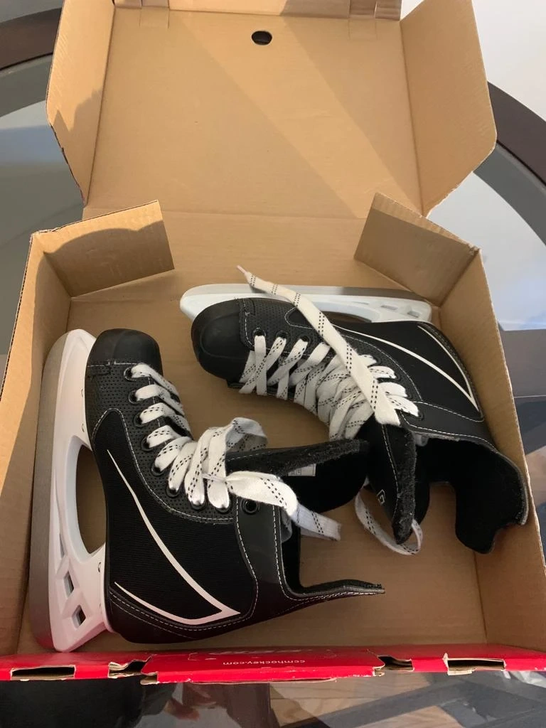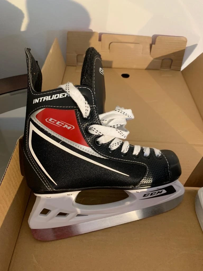 These CCM Intruder D JR skates are in youth size 1. They are black with red and white accents. The skates come in their original box. Used only once.