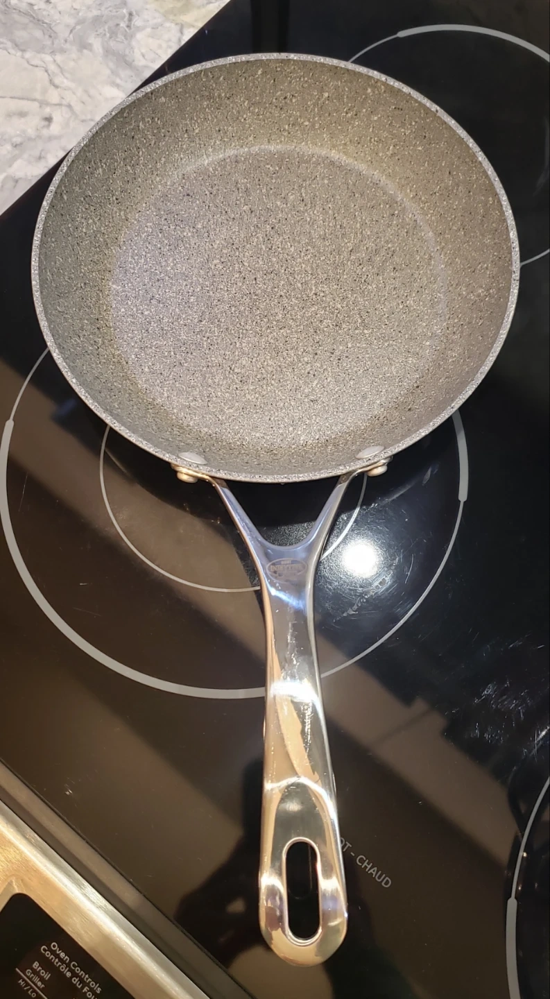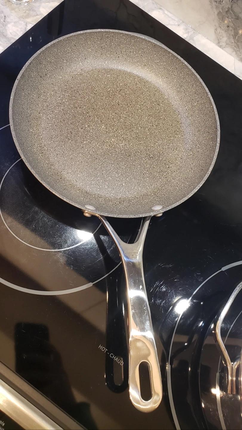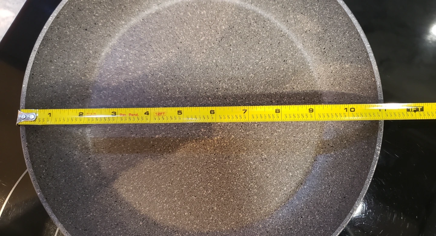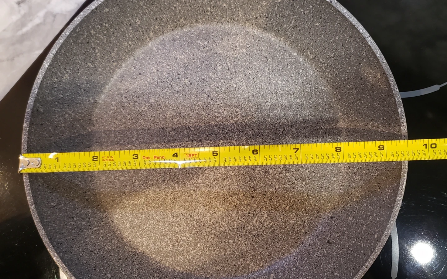 Matching small and large Ballarini frying pans. Measures 9.5 & 11 inches in diameter. Inner flat surface 7¼ & 8¼ inches diameter. High and long bevel sides excellent for flipping sauté back into the center of the pan and for containing splatter.