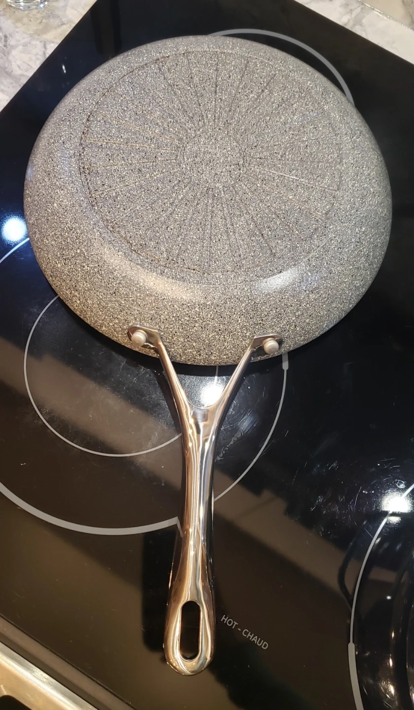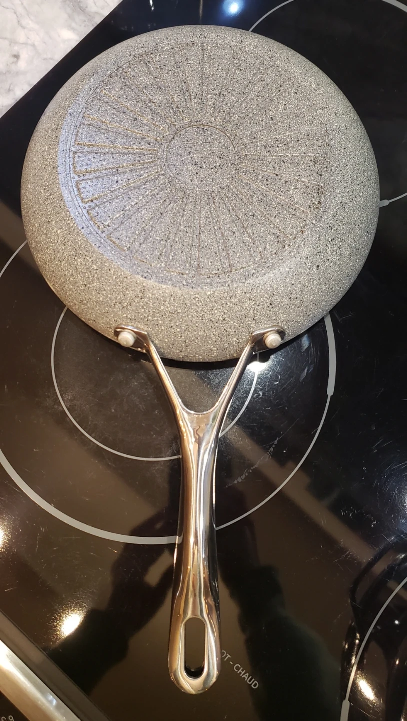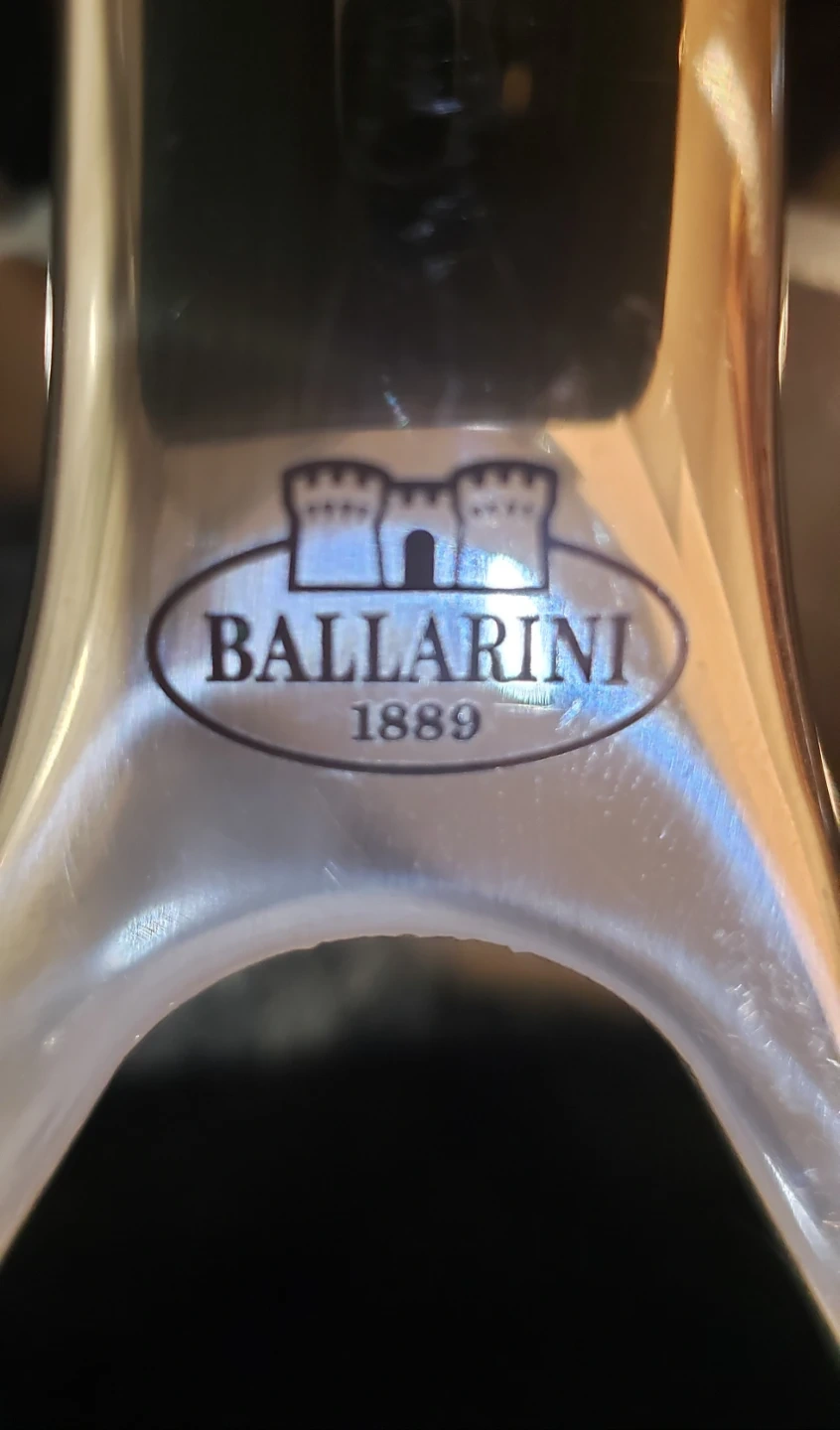 Matching small and large Ballarini frying pans. Measures 9.5 & 11 inches in diameter. Inner flat surface 7¼ & 8¼ inches diameter. High and long bevel sides excellent for flipping sauté back into the center of the pan and for containing splatter.