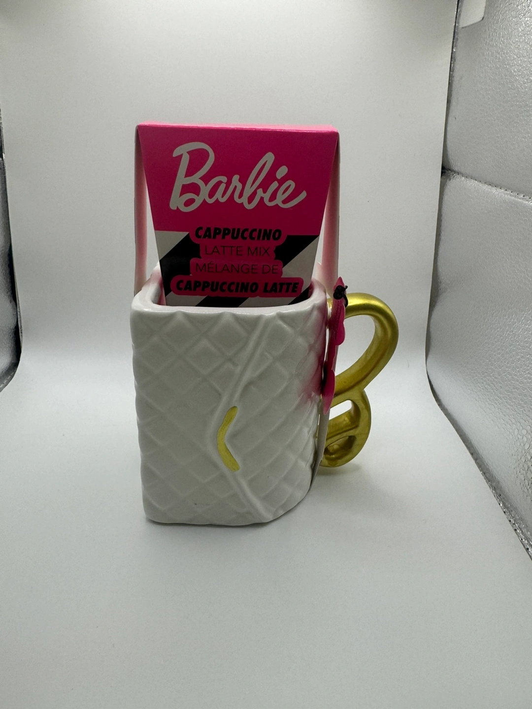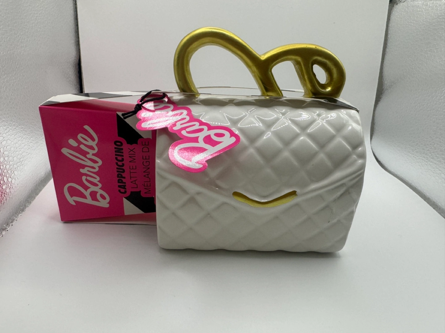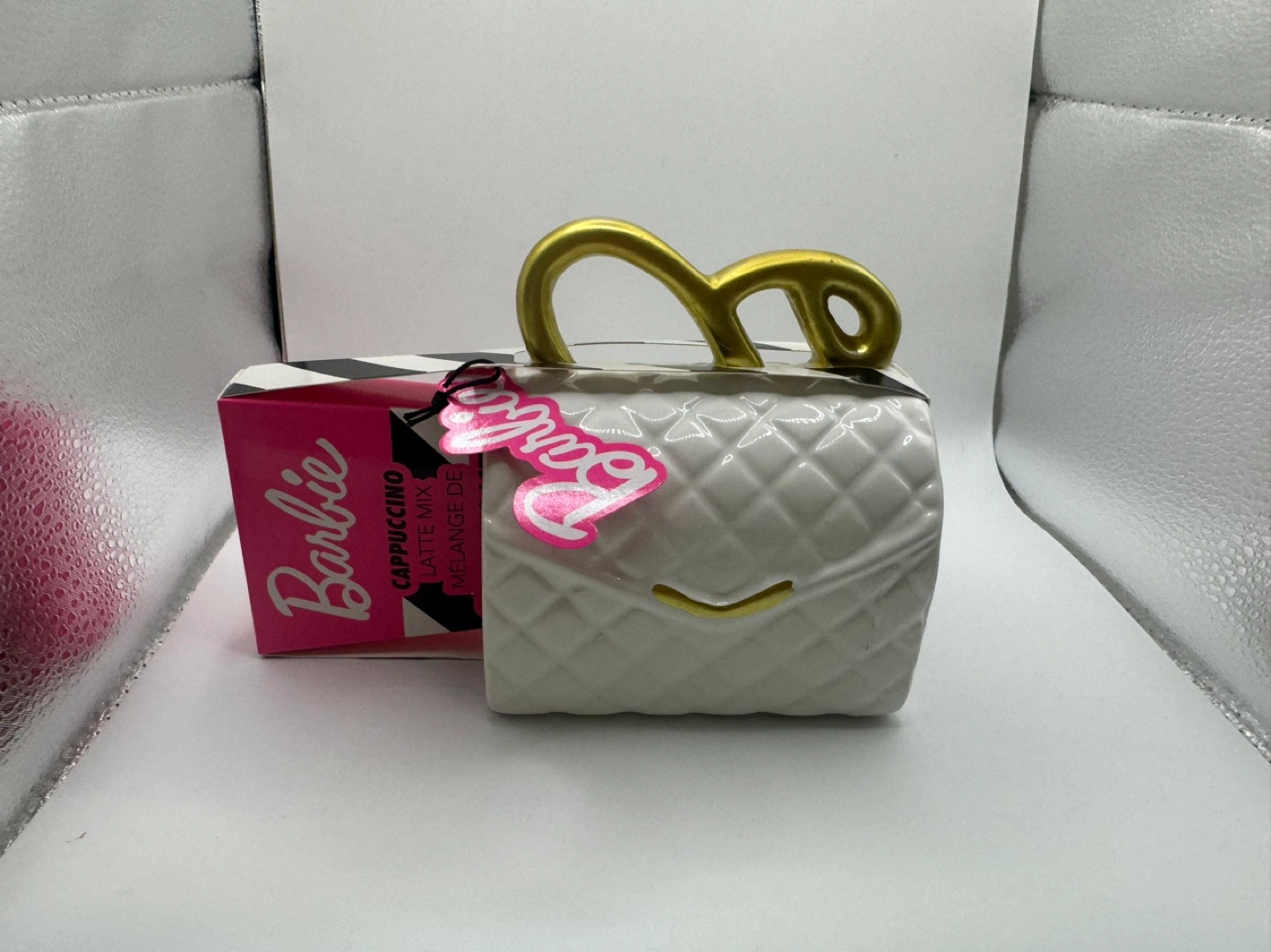 Adorable Barbie-themed mug. Shaped like a handbag, features a gold handle. Includes a cappuccino latte mix packet. Ceramic construction. Collectible item.