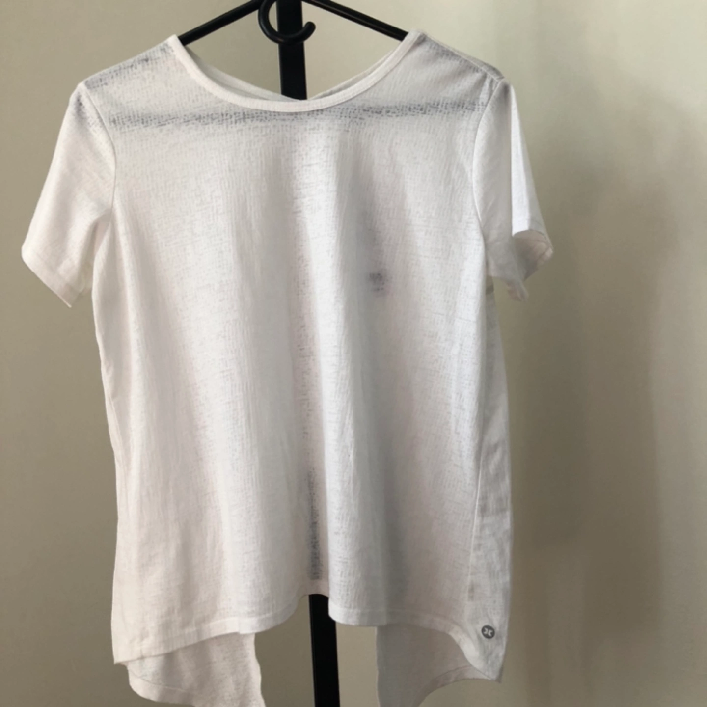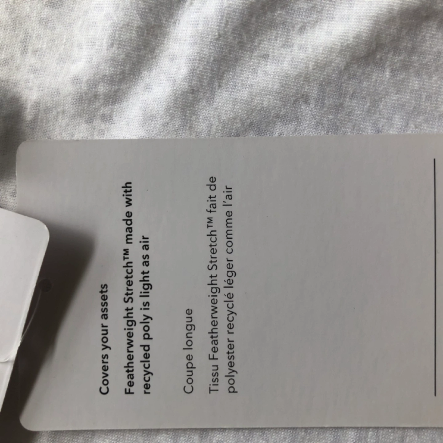 Featherweight stretch material. Open back detail. Asymmetrical hem (longer in the back, can be tied in a knot).