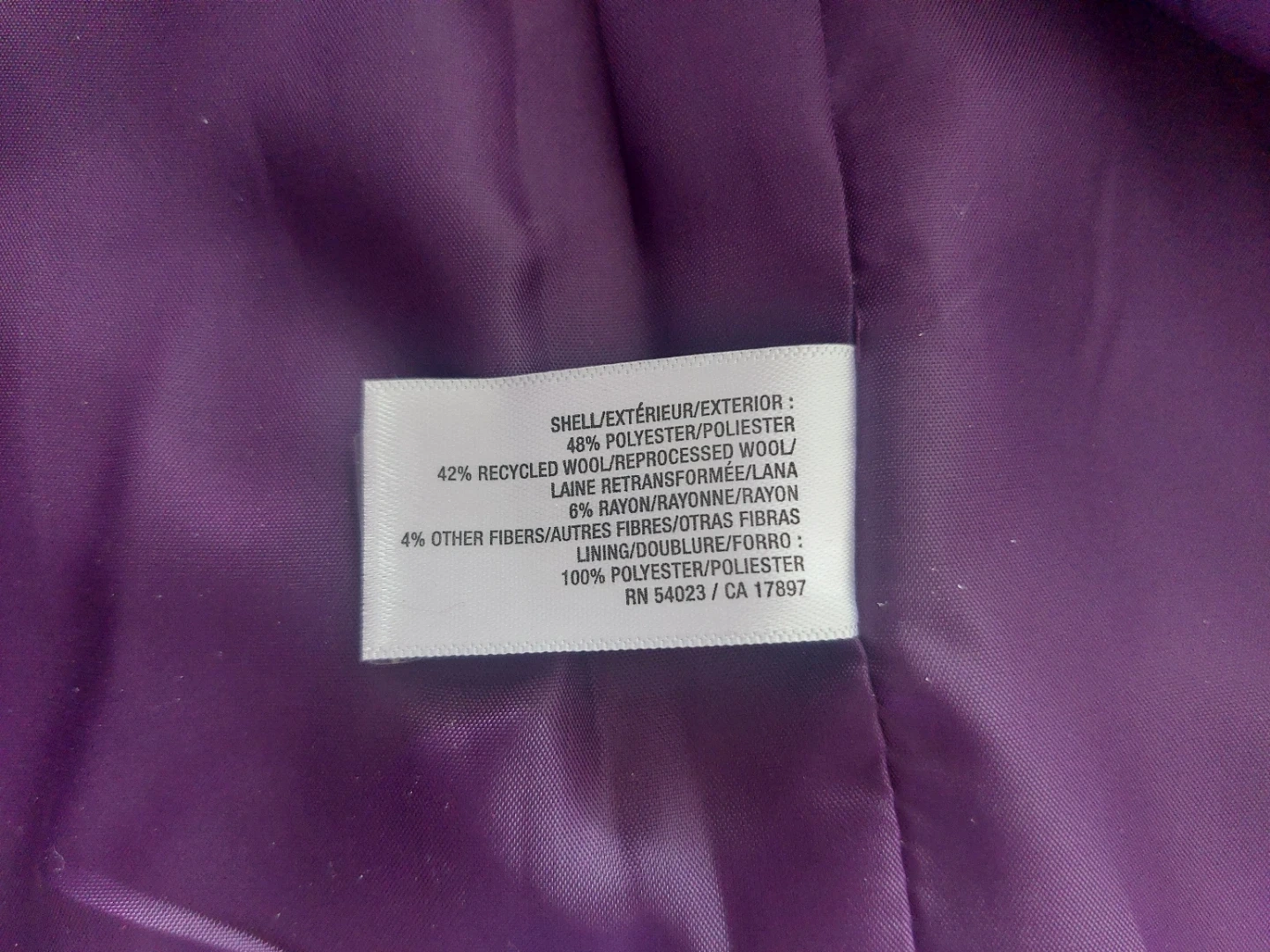 - Shell is 48% polyester, 42% recycled wool, 6% rayon and 4% othe fibers; Lining is 100% polyester