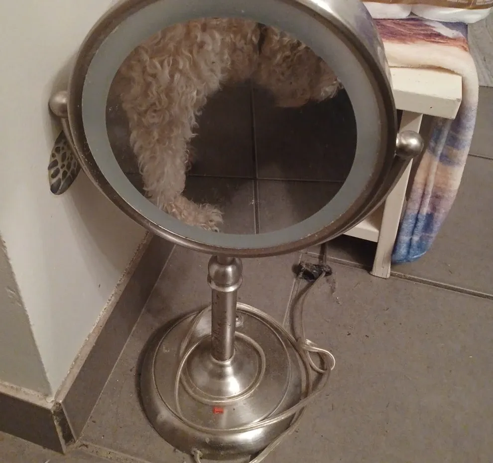 This is a standing vanity mirror with built-in illumination. The base and stand are made of metal. It's suitable for makeup application or other grooming tasks.