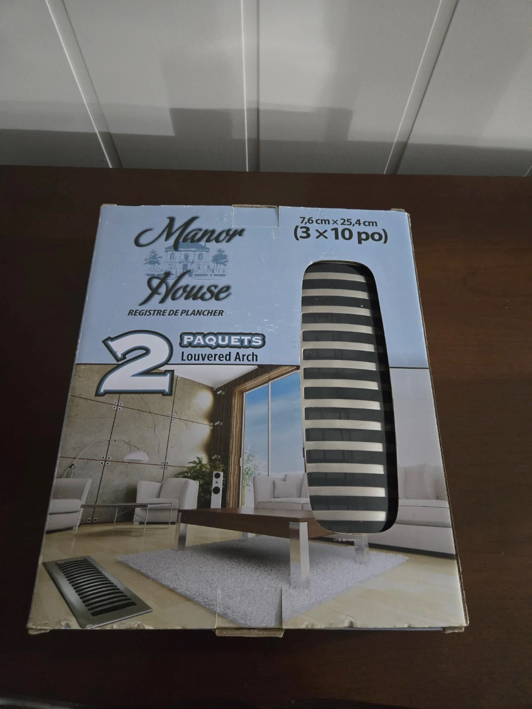 This is a 2-pack of Manor House Louvered Arch floor registers. Dimensions are 7.6 cm x 25.4 cm (3 x 10 inches). Pickup only mississauga.