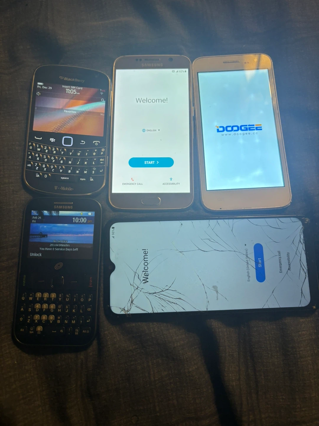 Includes two Samsung phones, one BlackBerry, and one Doogee phone. One of the Samsung phones and the Doogee phone are on the welcome screen. The BlackBerry has a full keyboard. One phone has a cracked screen…All are 100% functional…$40 for all five