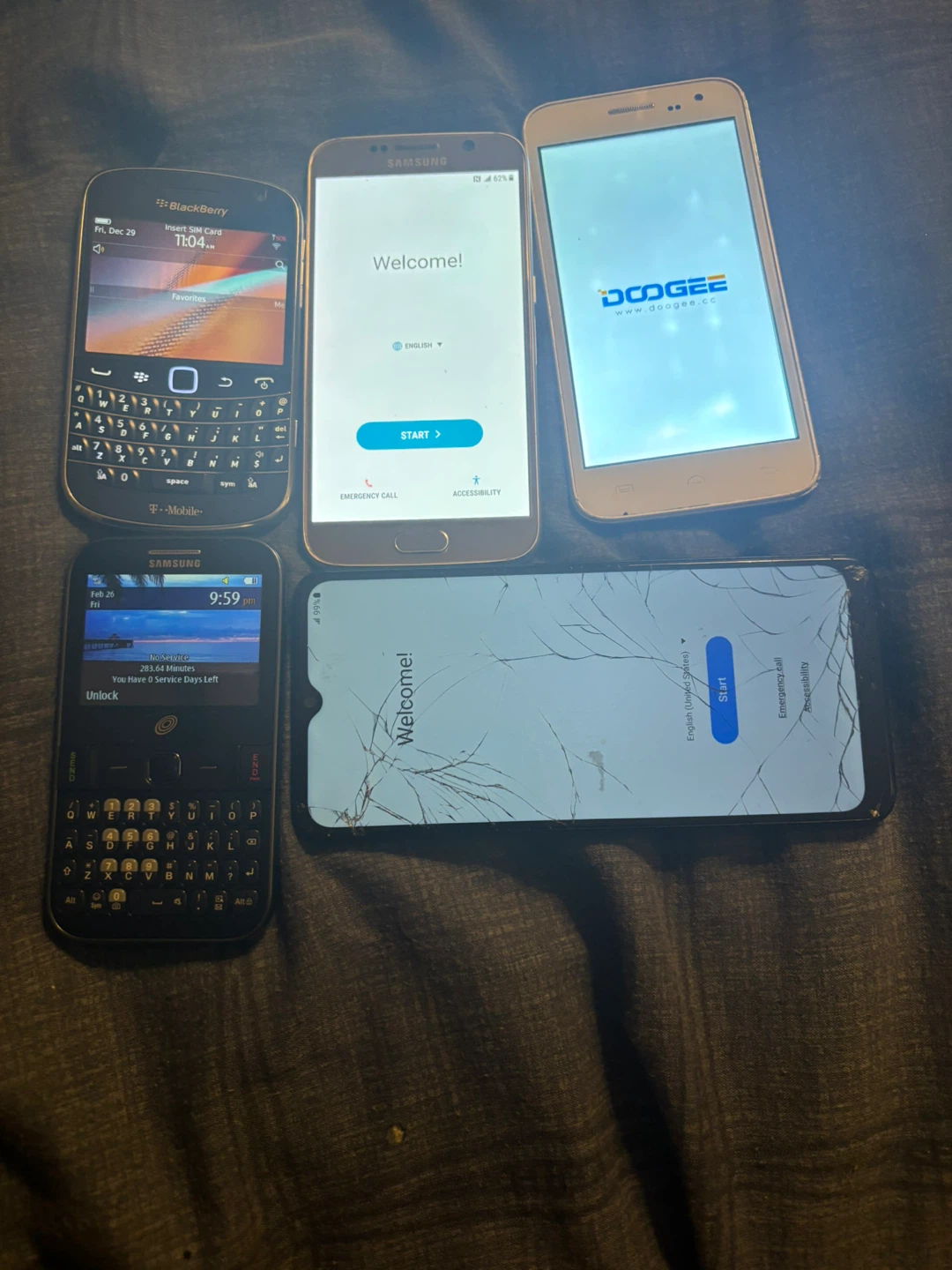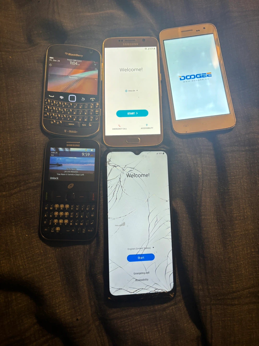 Includes two Samsung phones, one BlackBerry, and one Doogee phone. One of the Samsung phones and the Doogee phone are on the welcome screen. The BlackBerry has a full keyboard. One phone has a cracked screen…All are 100% functional…$40 for all five