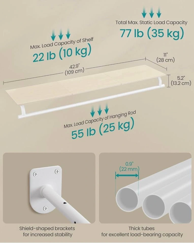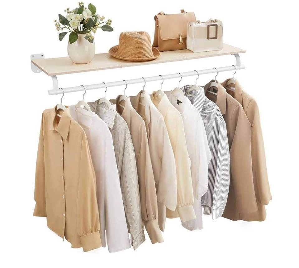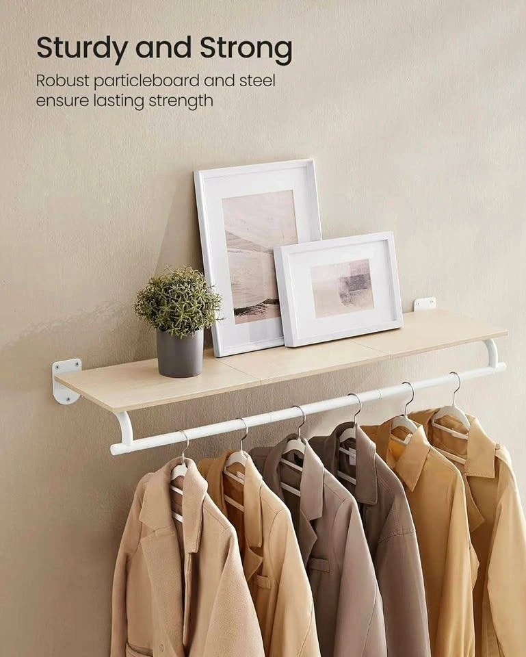 Stylish wall-mounted clothes rack with a top shelf and hanging rod — perfect for entryway, bedroom, or closet. Clean, modern look in Natural Beige & Cloud White fits both minimalist and Scandinavian interiors. Great solution for saving floor space while keeping clothes organized and accessible.