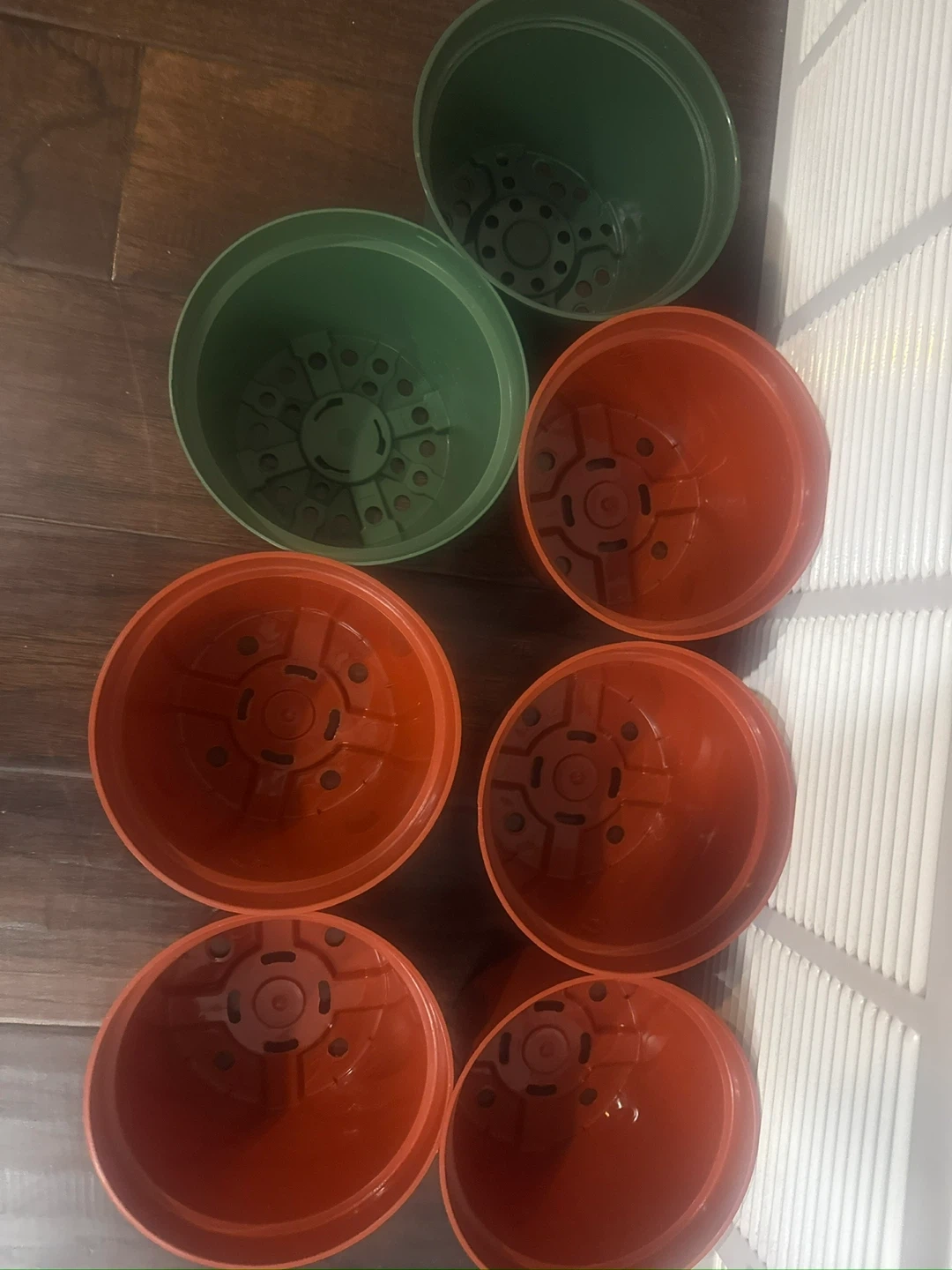 This is a set of seven plastic plant pots. Two pots are green, and five pots are terra cotta coloured. They're designed with drainage holes at the bottom. These pots are suitable for starting seedlings or housing small plants.
