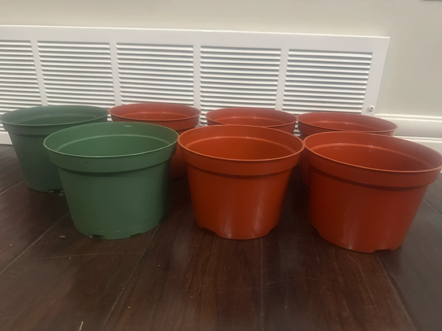 This is a set of seven plastic plant pots. Two pots are green, and five pots are terra cotta coloured. They're designed with drainage holes at the bottom. These pots are suitable for starting seedlings or housing small plants.