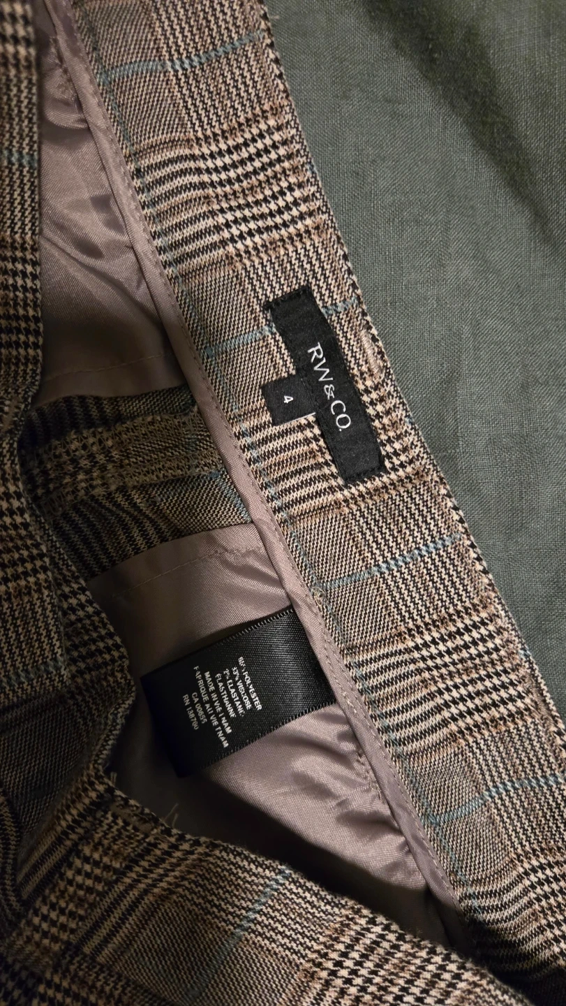 These RW&CO. trousers feature a classic plaid pattern. They're made of a polyester blend with a satin-like lining. Size is 4.