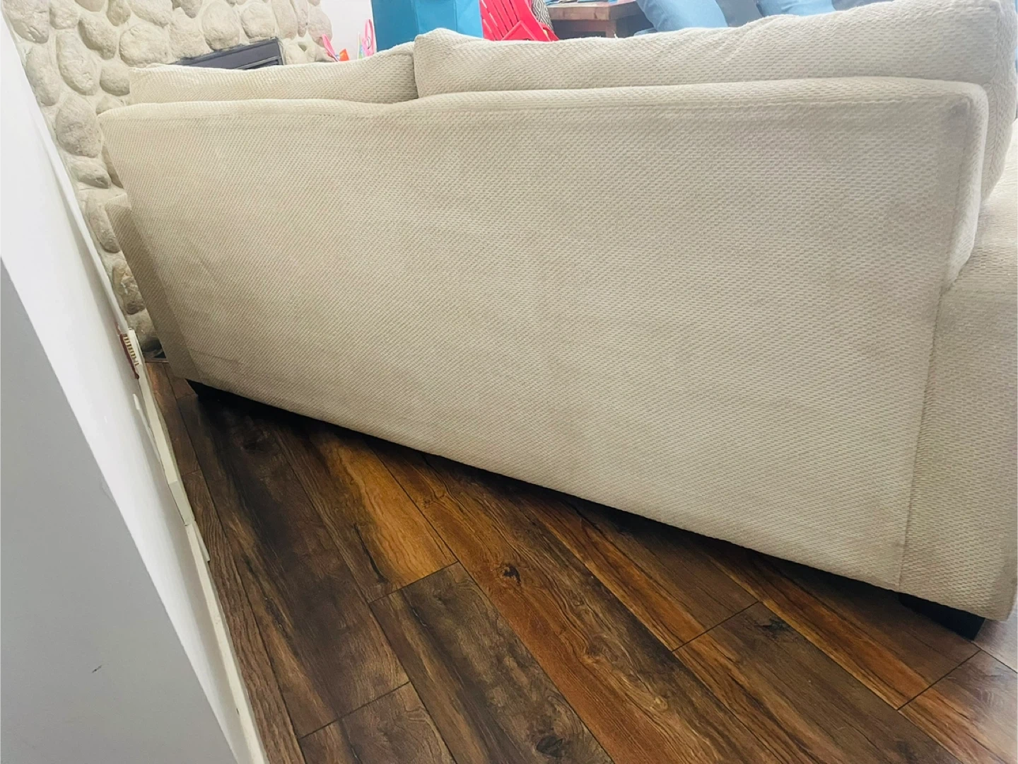 A comfy cream or beige sofa, perfect for your living room. It features plush cushions and a durable fabric. This sofa is great for relaxing or entertaining guests.