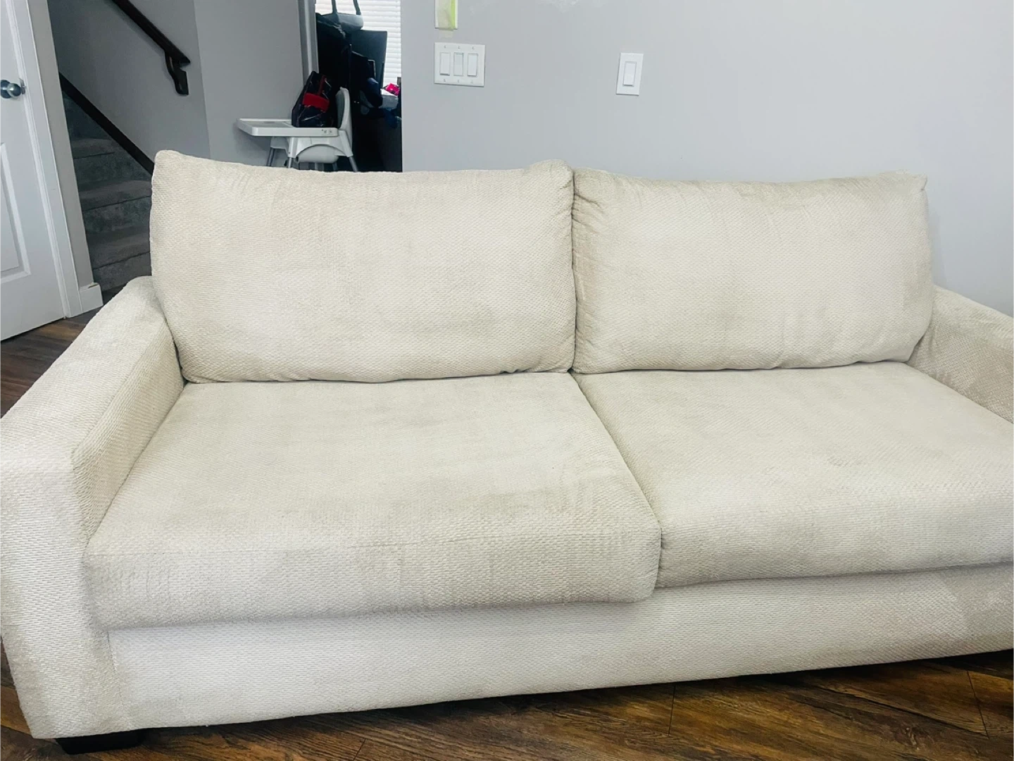 A comfy cream or beige sofa, perfect for your living room. It features plush cushions and a durable fabric. This sofa is great for relaxing or entertaining guests.