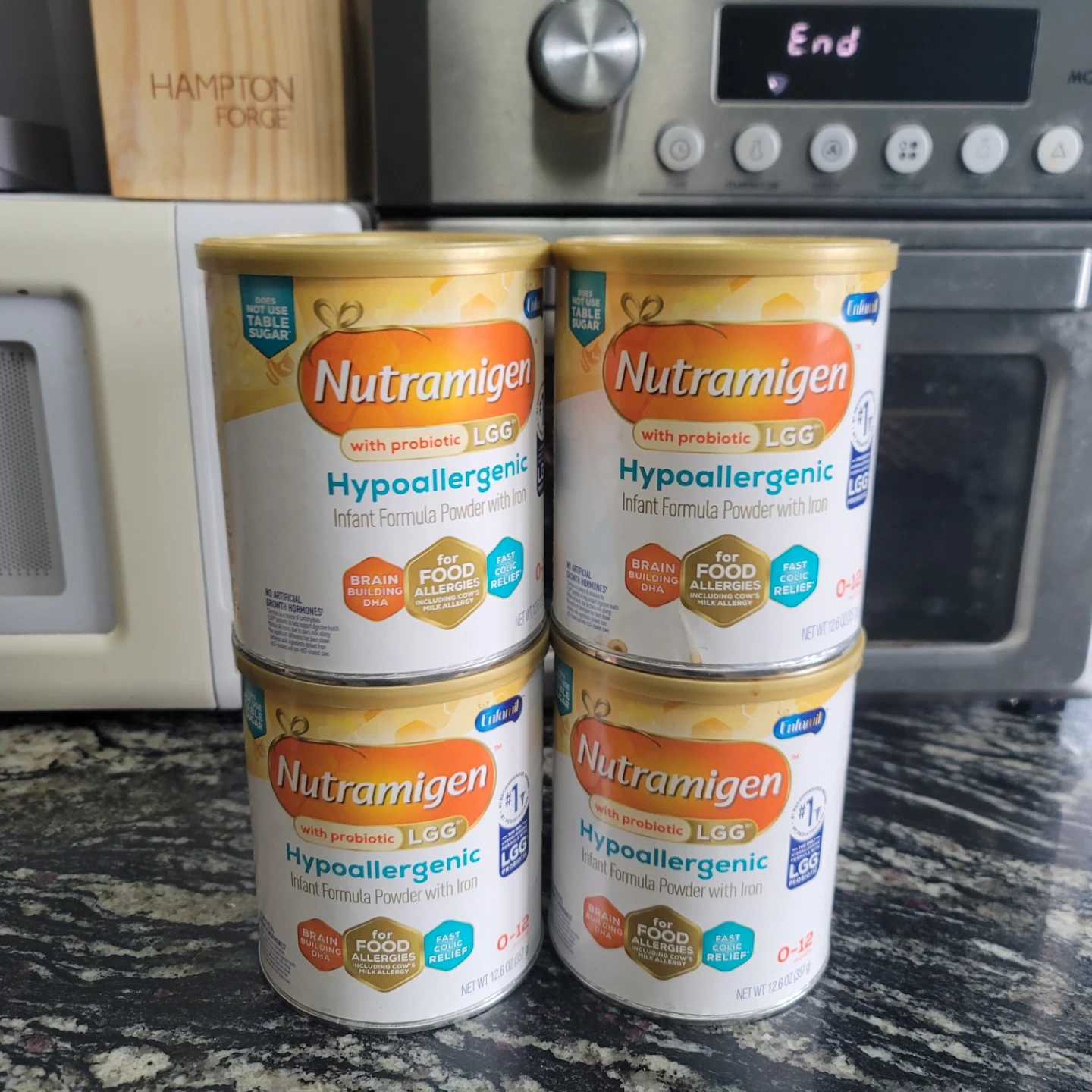 Four cans of Nutramigen Hypoallergenic Infant Formula Powder. It's made with probiotic LGG and iron. Each can is 12.6 oz. This formula is for food allergies, including cow's milk allergy. It also provides fast colic relief.