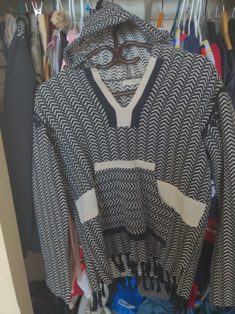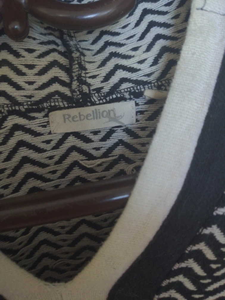 This Rebellion hooded sweater features a black and white chevron pattern. It's made with a soft knit material and has a fringed hem. A kangaroo pocket is on the front.