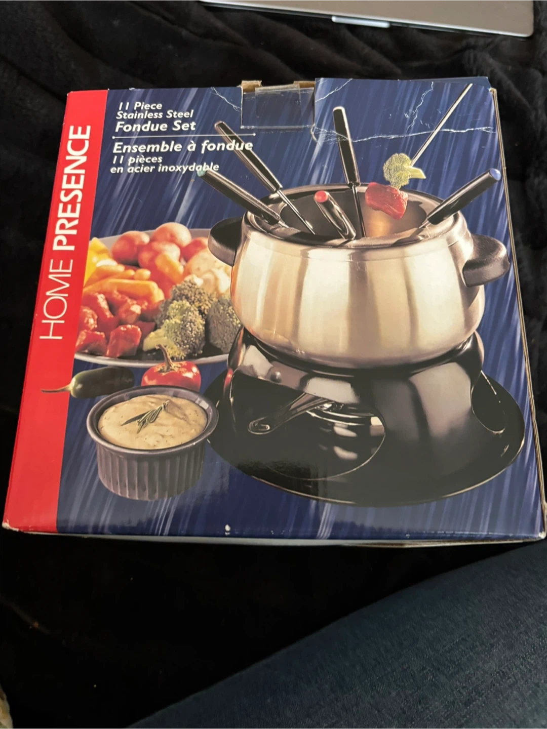 This Home Presence fondue set comes with 11 pieces, all made from stainless steel. It's perfect for parties or cozy nights in. A great way to enjoy melted cheese or chocolate with friends! New, never used. Pick up at King and Niagara st