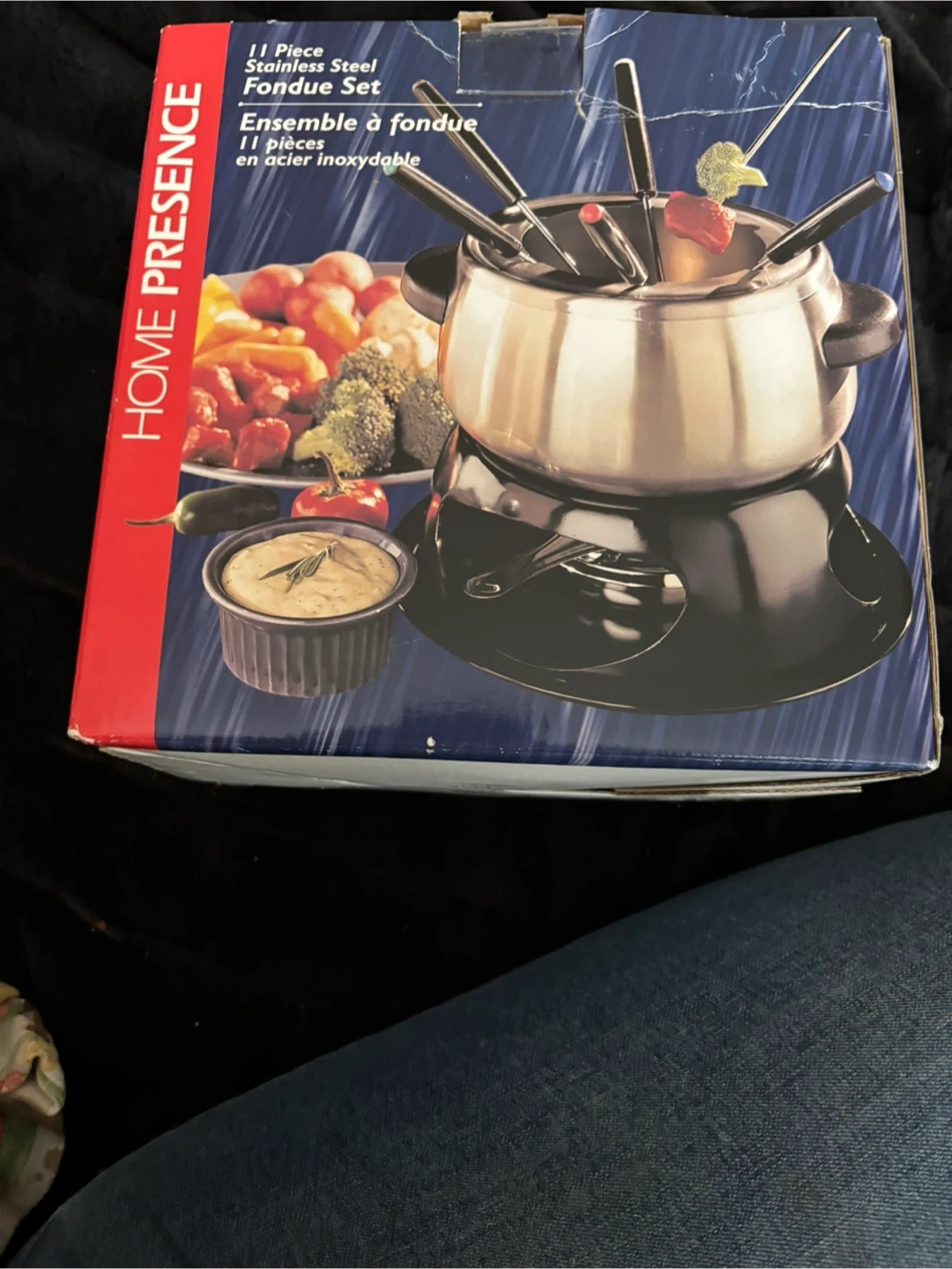 This Home Presence fondue set comes with 11 pieces, all made from stainless steel. It's perfect for parties or cozy nights in. A great way to enjoy melted cheese or chocolate with friends! New, never used. Pick up at King and Niagara st
