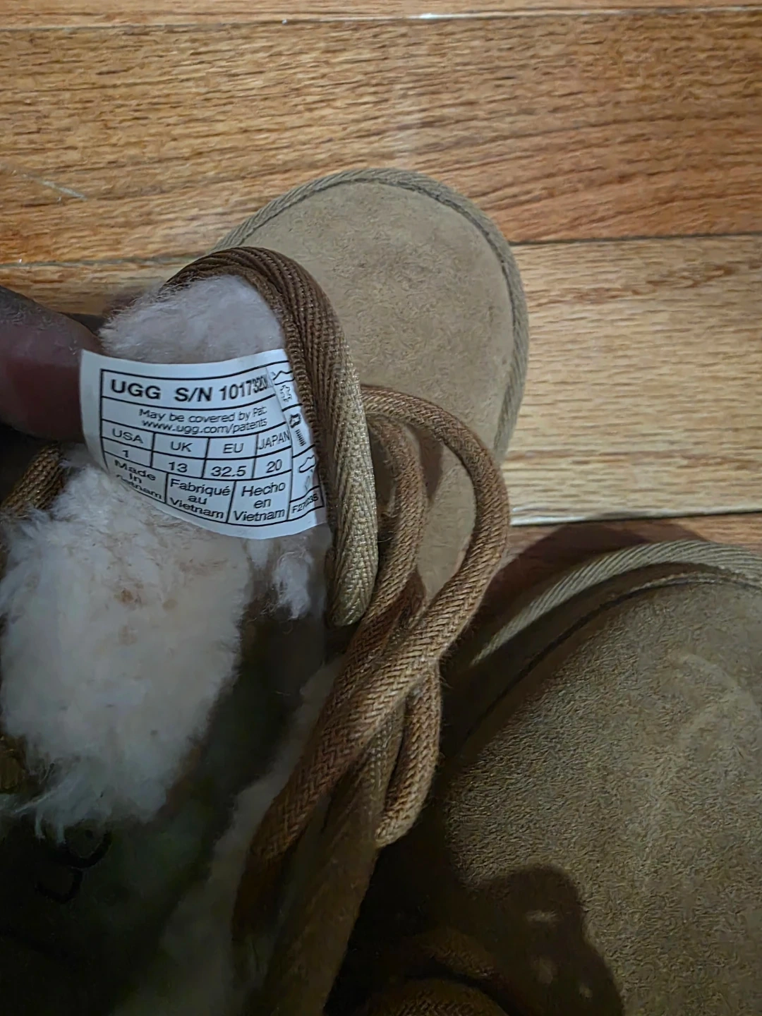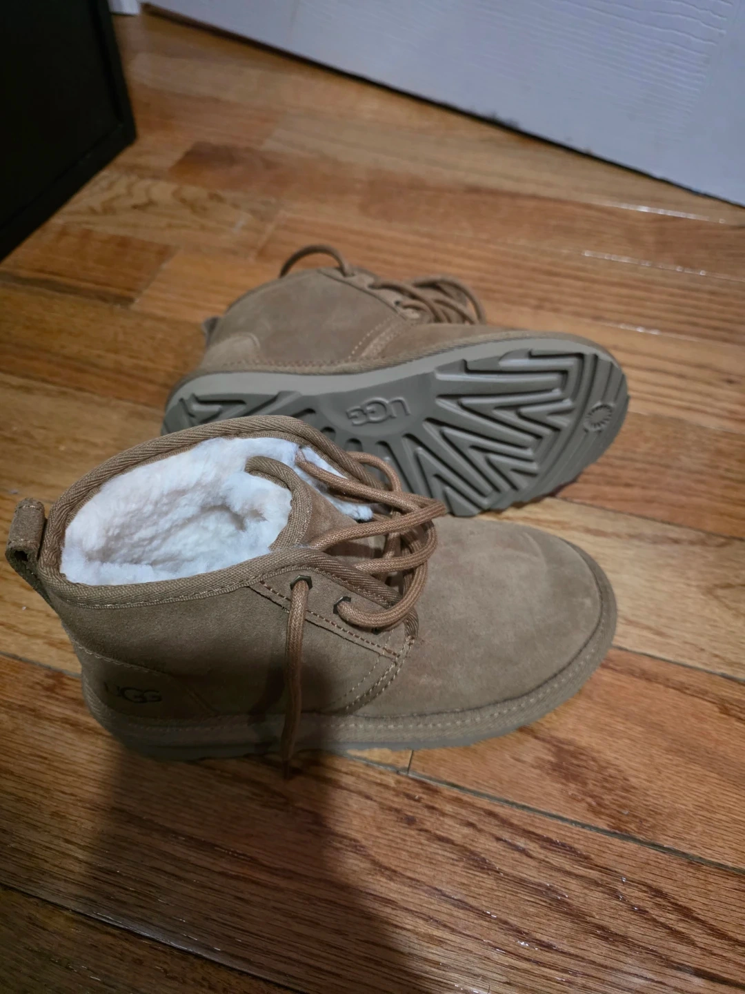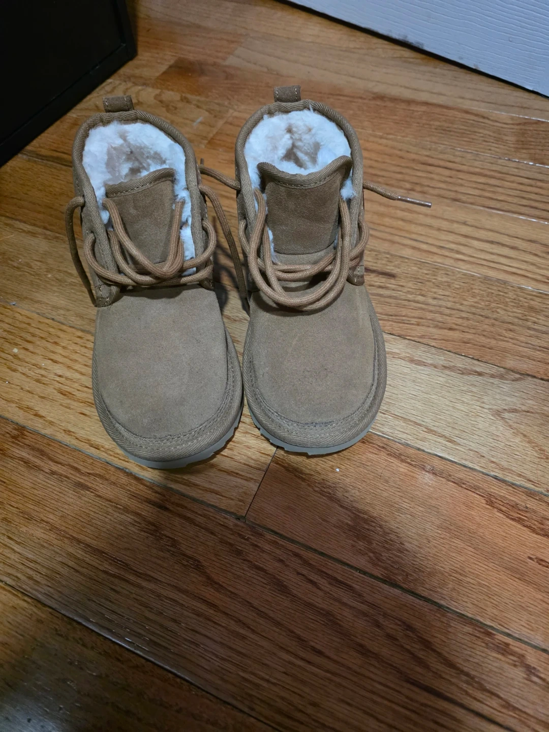These UGG chukka boots are made with suede and feature a cozy, fluffy lining. They're perfect for keeping little feet warm. Size 1 USA, 13 UK, 32.5 EU.