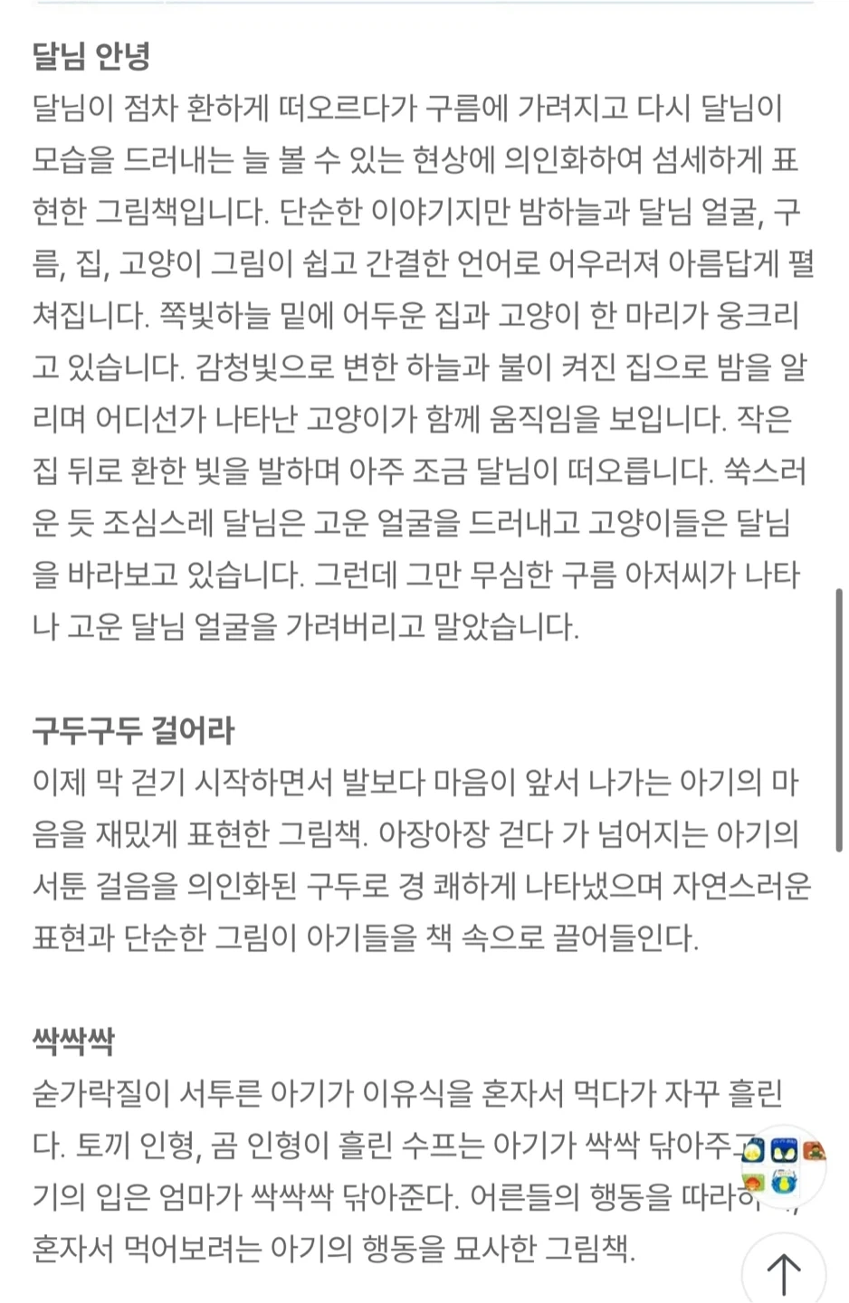 〈달님 안녕〉은 밤을 환하게 밝히는 달님을 마치 사람처럼 그려낸 그림책입니다. 쉬운 언어로 이루어진 짧은 이야기가 단순하면서도 감성적인 그림과 어우러져 아름답게 펼쳐집니다. 유아들이 가지고 있을 밤에 대한 공포심과 두려움을 잠재워줍니다. 〈손이 나왔네〉는 유아들에게 옷을 입는 순서를 가르쳐주는 그림책입니다. 몸의 구조도 자연스럽게 일깨워주고 있습니다. 혼자 옷을 입는 아기의 생동감 넘치는 표정을 통해 성취감을 맛보게 해줍니다.