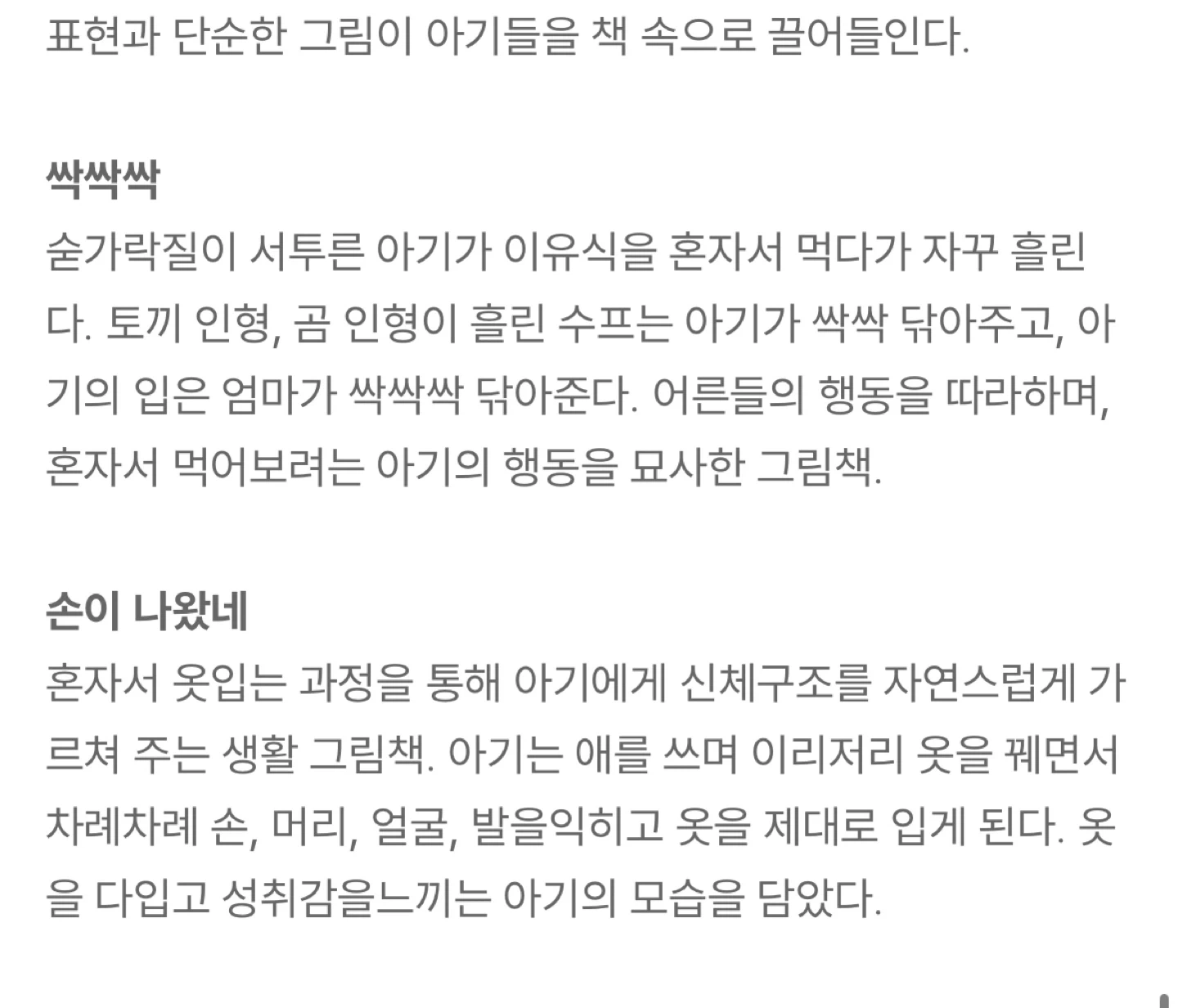〈달님 안녕〉은 밤을 환하게 밝히는 달님을 마치 사람처럼 그려낸 그림책입니다. 쉬운 언어로 이루어진 짧은 이야기가 단순하면서도 감성적인 그림과 어우러져 아름답게 펼쳐집니다. 유아들이 가지고 있을 밤에 대한 공포심과 두려움을 잠재워줍니다. 〈손이 나왔네〉는 유아들에게 옷을 입는 순서를 가르쳐주는 그림책입니다. 몸의 구조도 자연스럽게 일깨워주고 있습니다. 혼자 옷을 입는 아기의 생동감 넘치는 표정을 통해 성취감을 맛보게 해줍니다.
