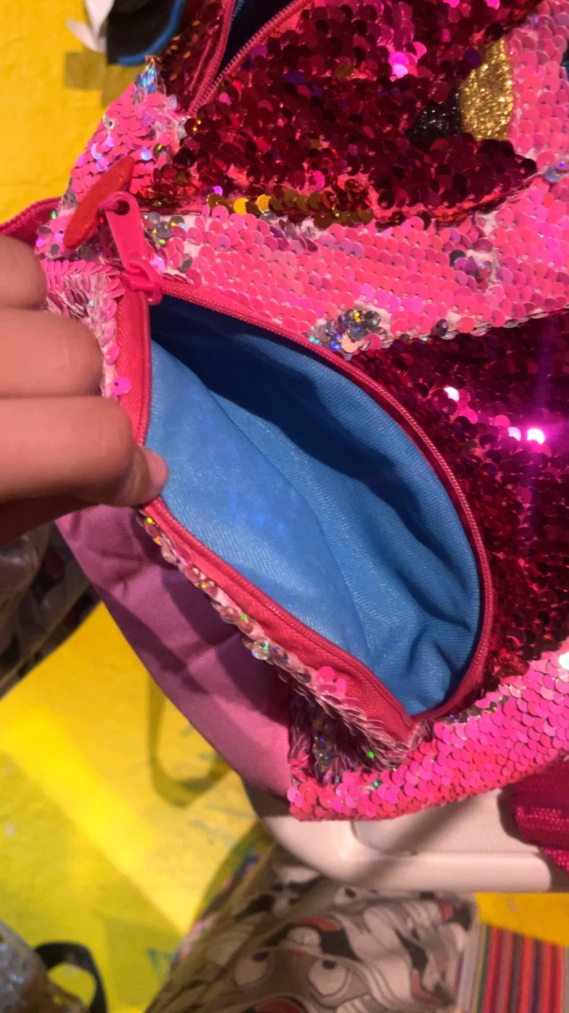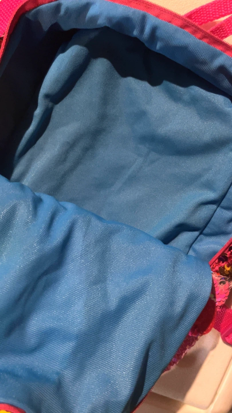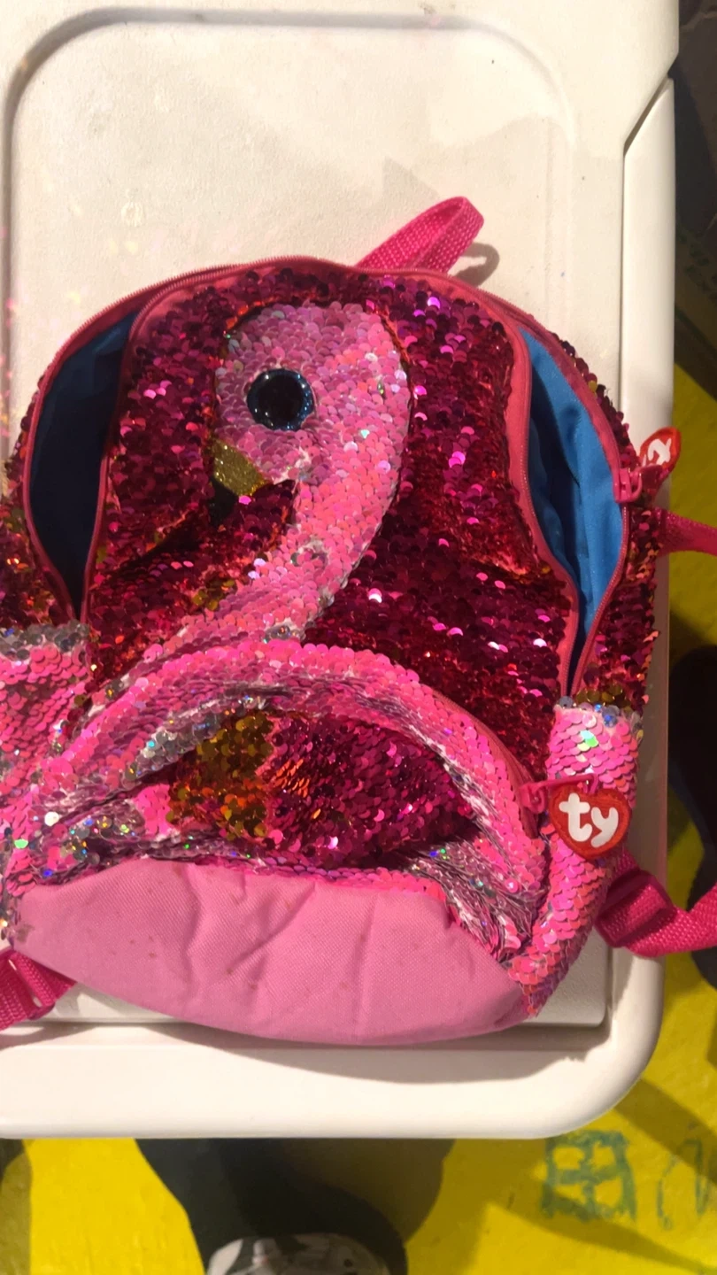 Adorable pink sequin backpack featuring a Ty Beanie Boo flamingo design. It has a zippered main compartment with a blue lining and adjustable straps. Perfect for little ones to carry their essentials!